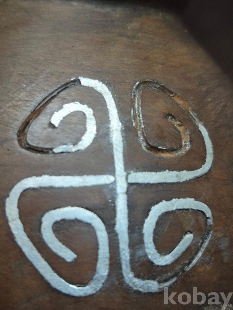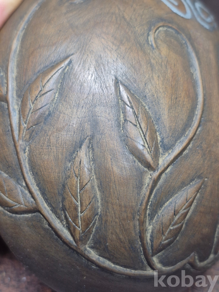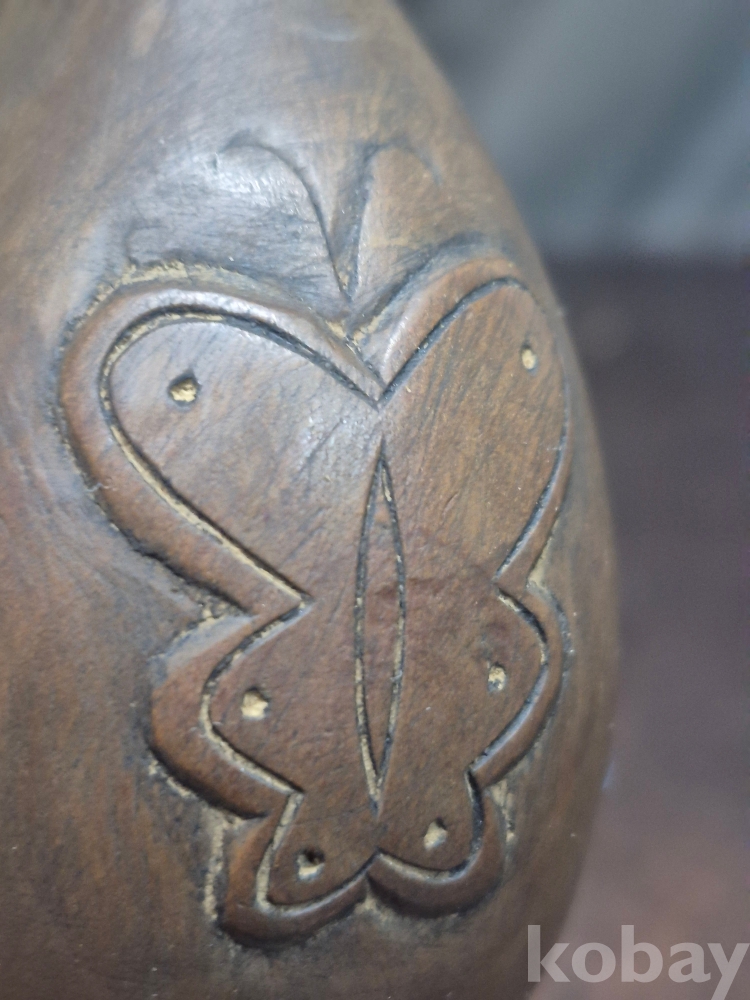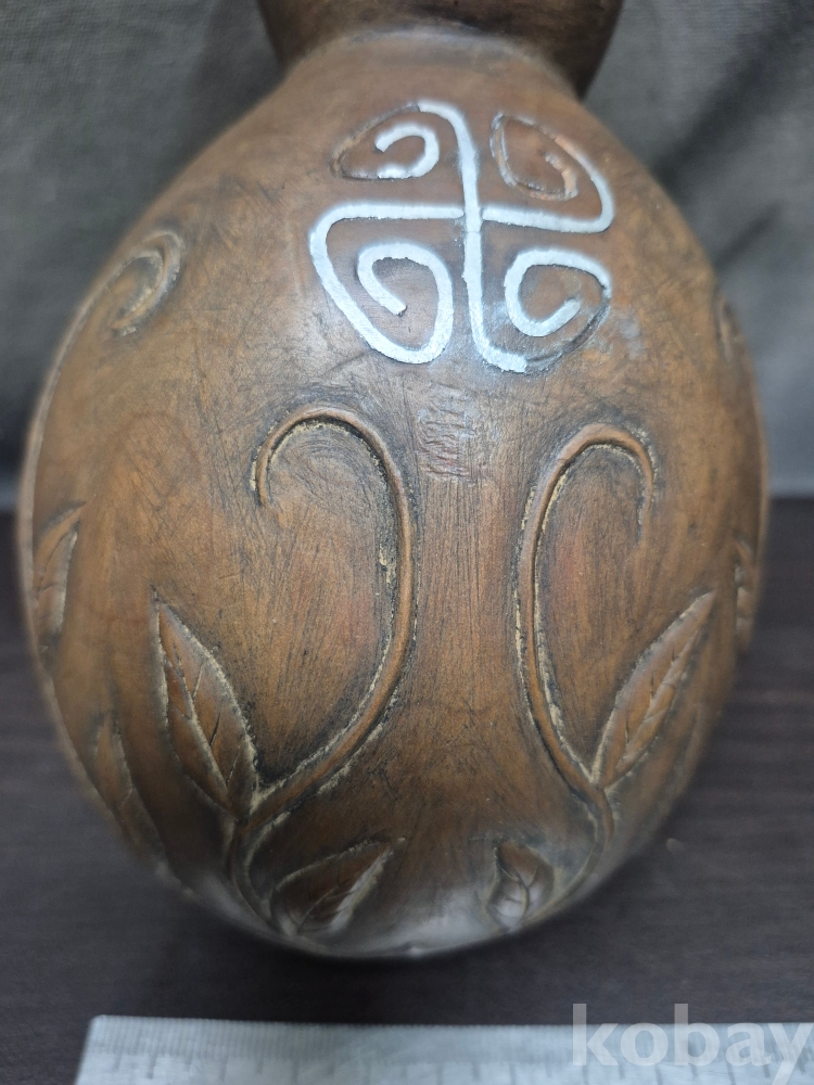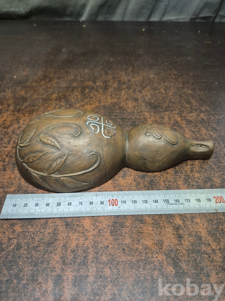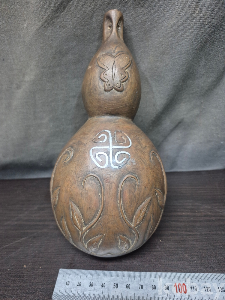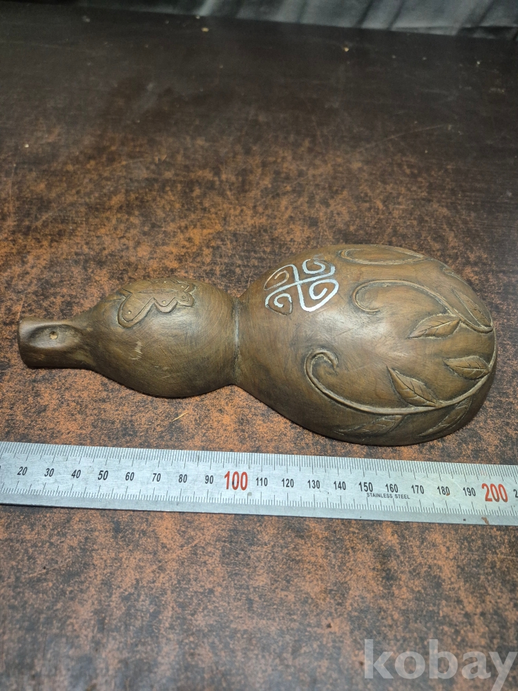 고목을 표주박 형태로 깍아만들고 나비와 덩굴을 형상하고 은상감을 넣어 표현한 오래된 작품 땟물이 꼬질꼬질합니다 10.5*21.5*5