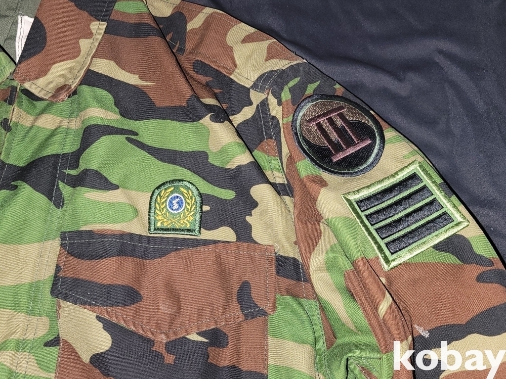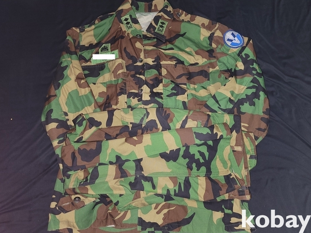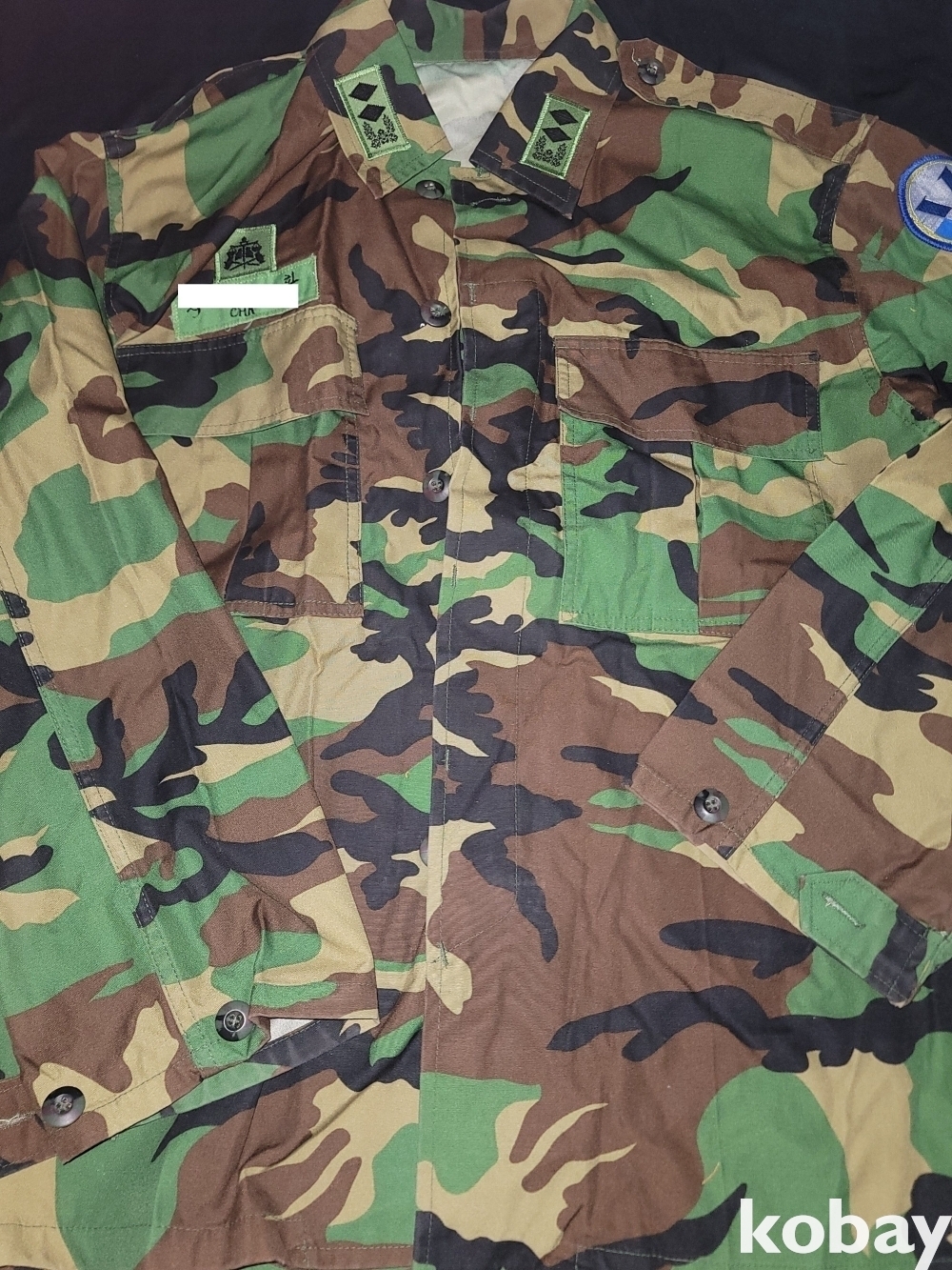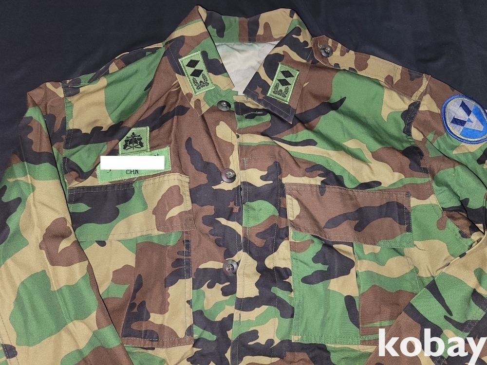 빈티지 희귀한 제5포병여단 중위 간부의 장교용 개구리 무늬 군복 상하의 세트입니다.
