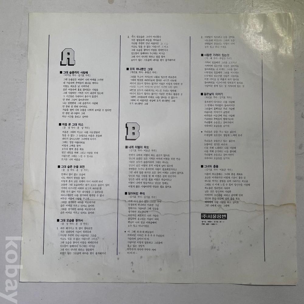 | 자켓상태 | EX : 약간의 마모, 모서리 찢김 존재 | 음반상태 | EX : 재생에 영향 없는 가벼운 기스 존재 | 발매정보 | 알수없음 | 가사지여부 | 유 |