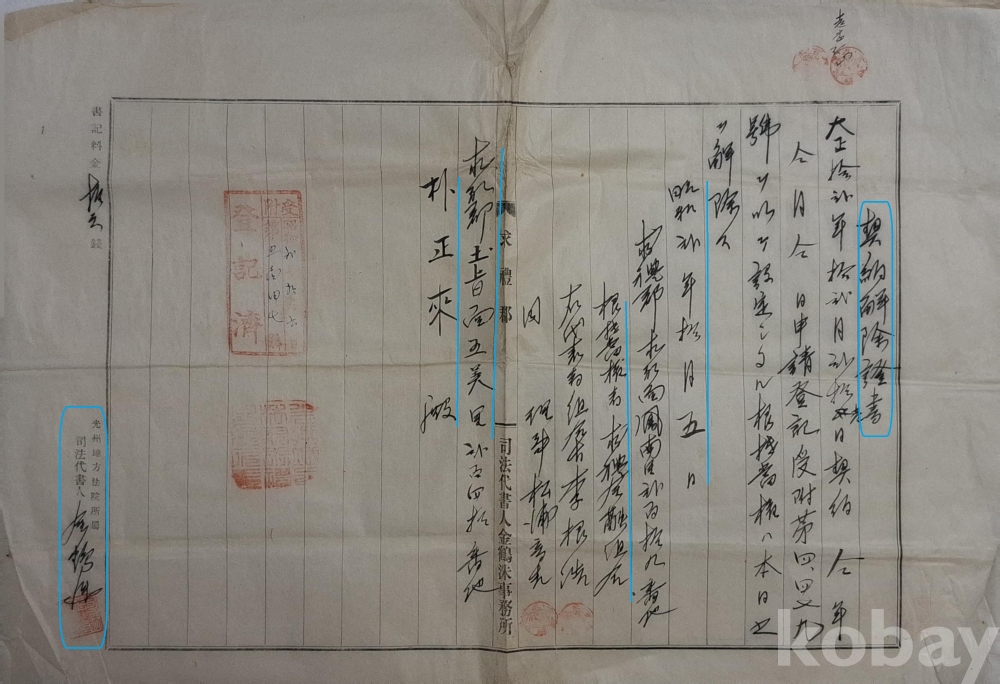 구례군 토지면 오미리 박정래(朴正來)에게 보낸 계약해제증서(契約解除證書).
