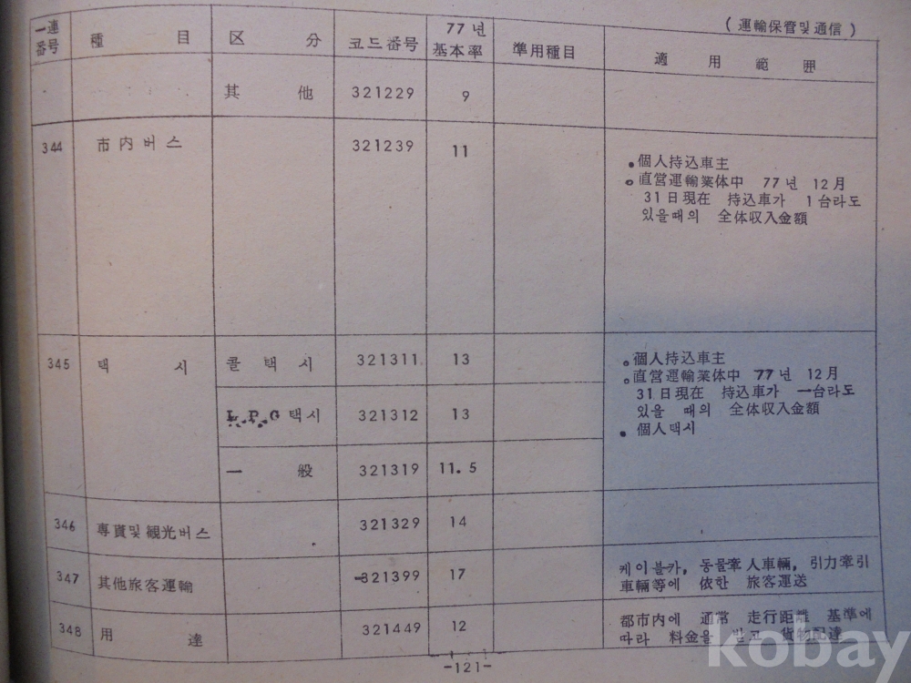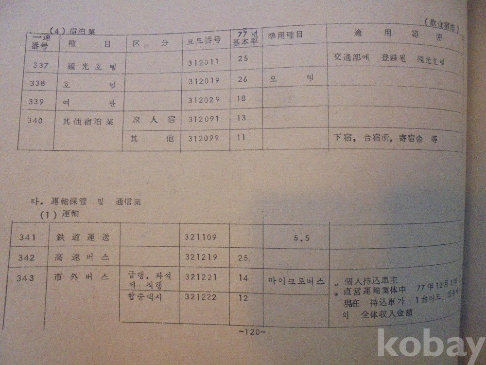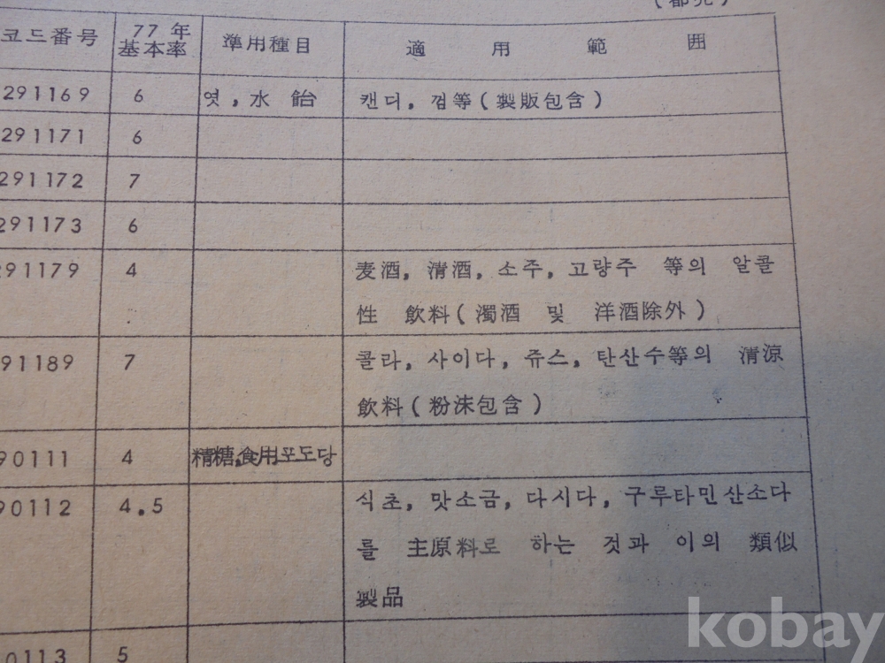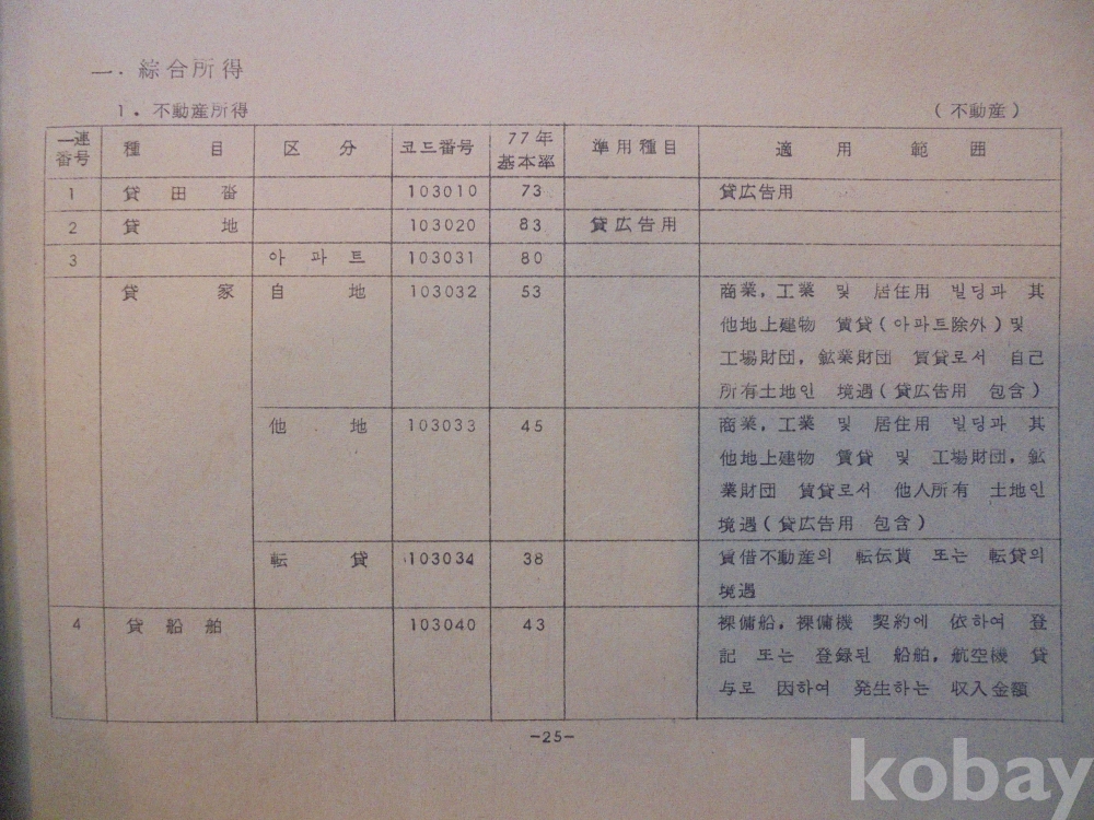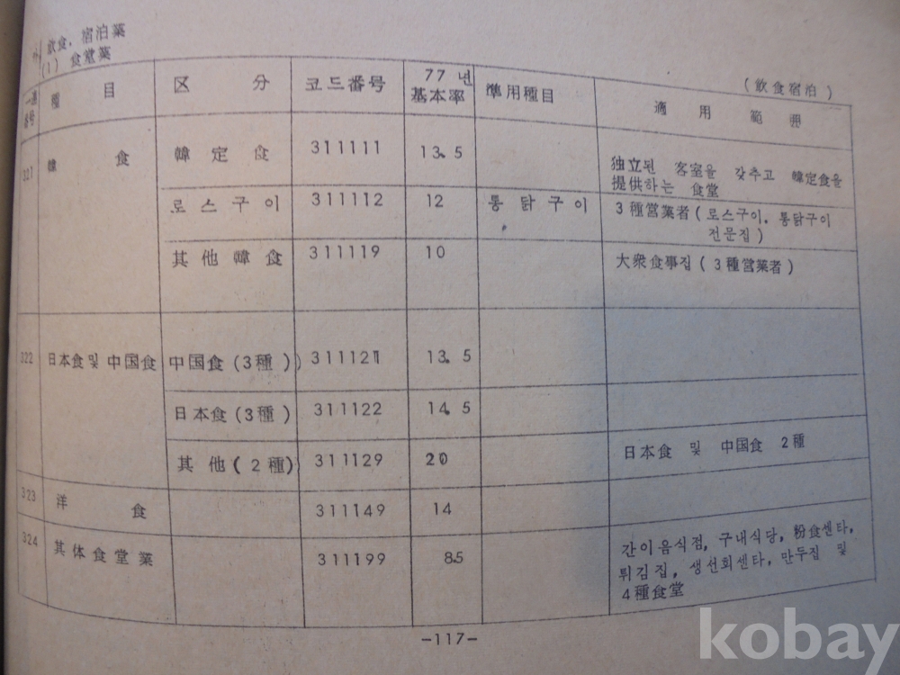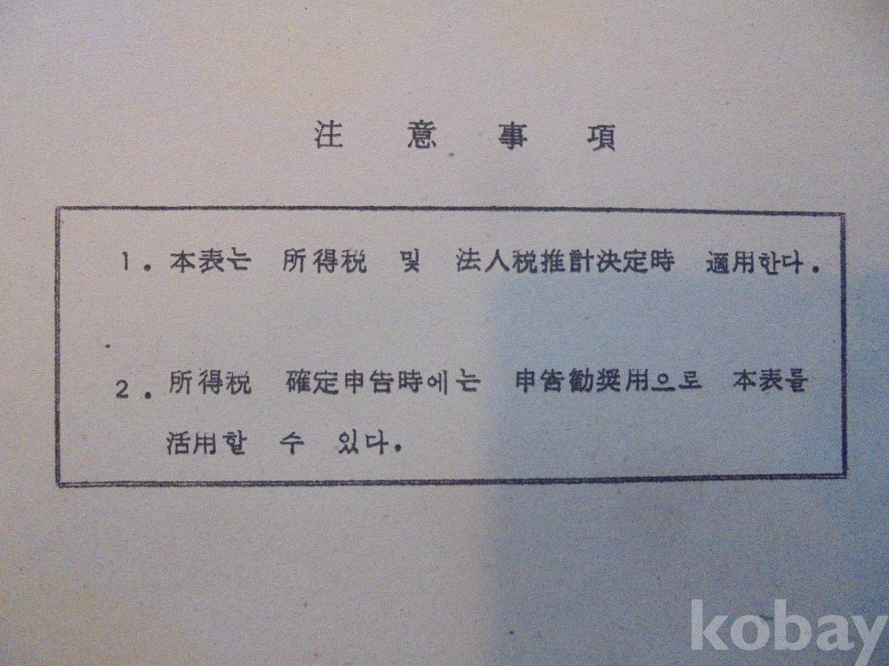 1978년 대한민국 소득표준율표 자료로서 그당시 물가와 시대상이 기록된 극희귀근대사 자료입니다.