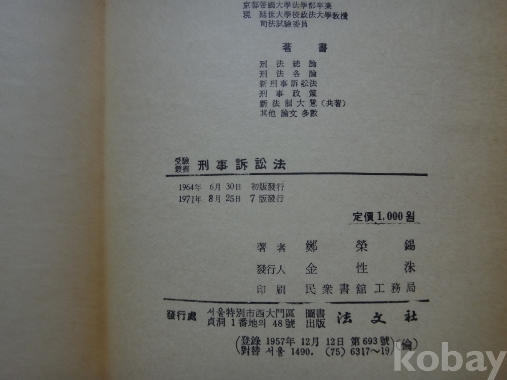 형사소송법 (1971년, 정영석 저, 법문사)