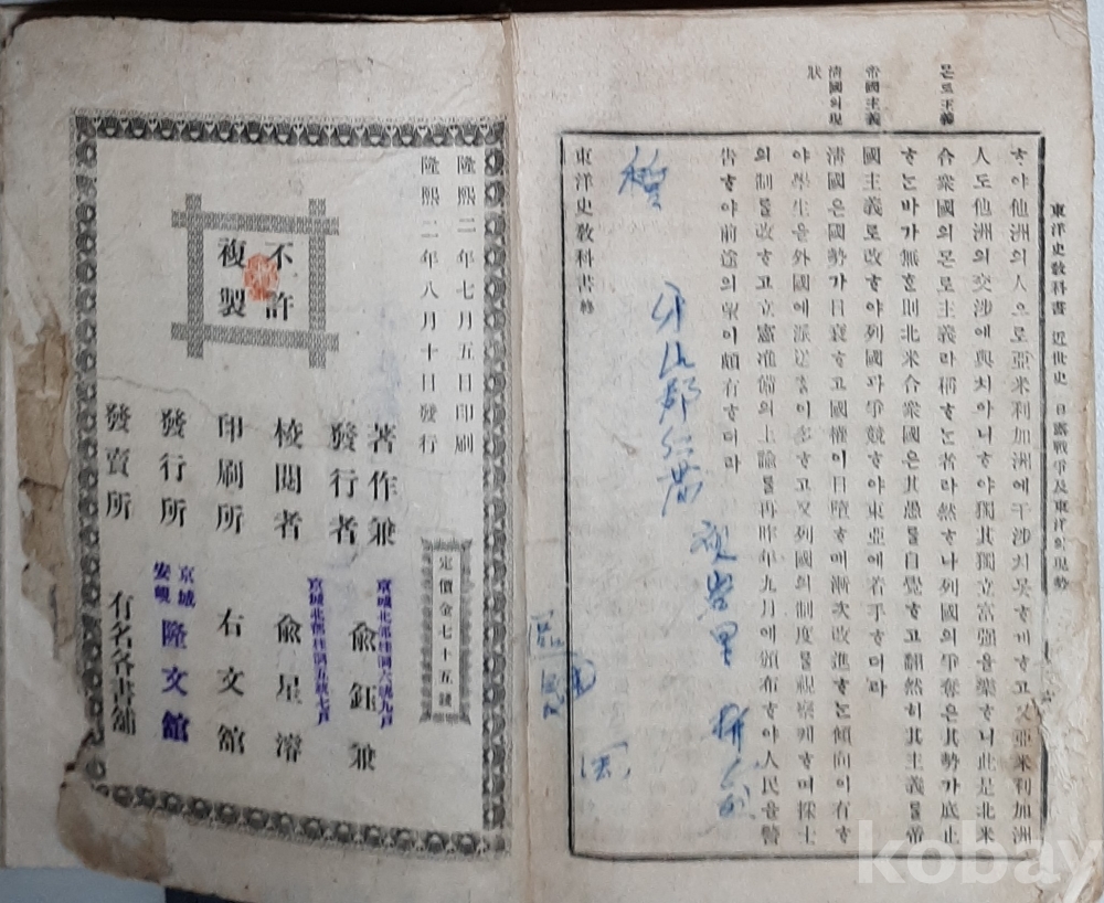 (귀한 구한말교과서)동양사교과서-유옥겸 저 융희2년(1908년)초판 융문관 발행