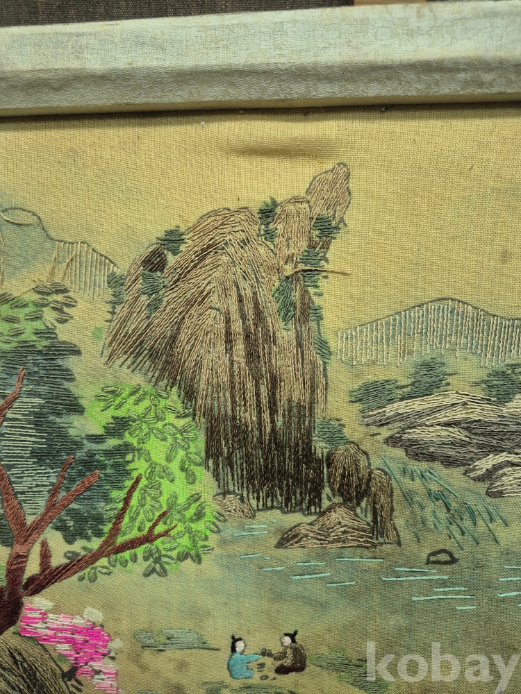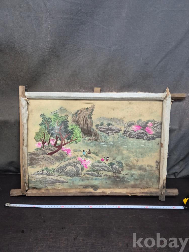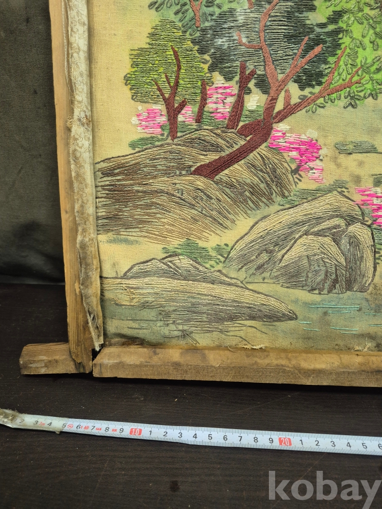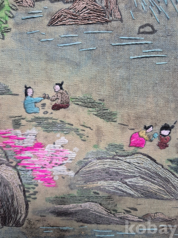 1950년대 손자수로 만든 액자 형태의 무릉도원에서 선비들이 즐기는 모습을 묘사한 제품 나무 부러짐 있어요 63*42*3