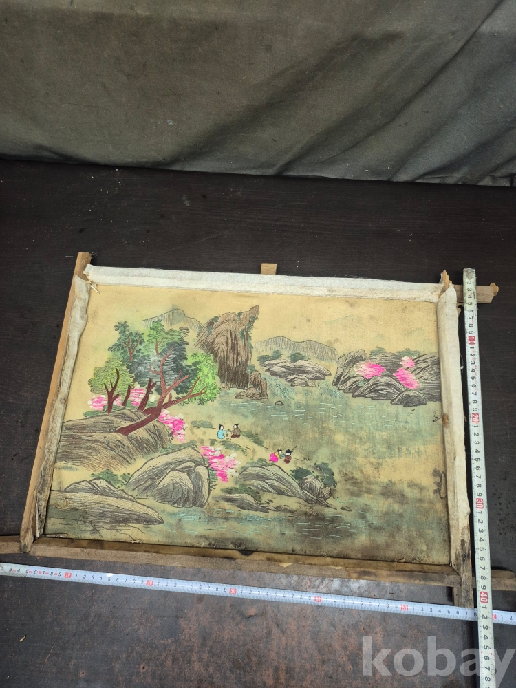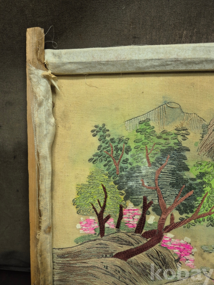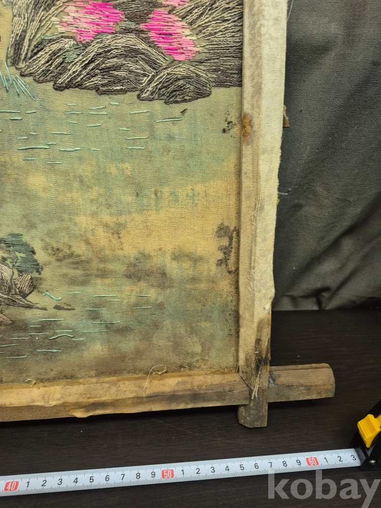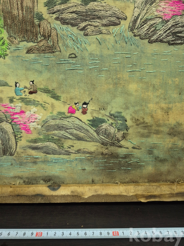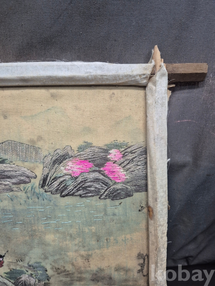1950년대 손자수로 만든 액자 형태의 무릉도원에서 선비들이 즐기는 모습을 묘사한 제품 나무 부러짐 있어요 63*42*3