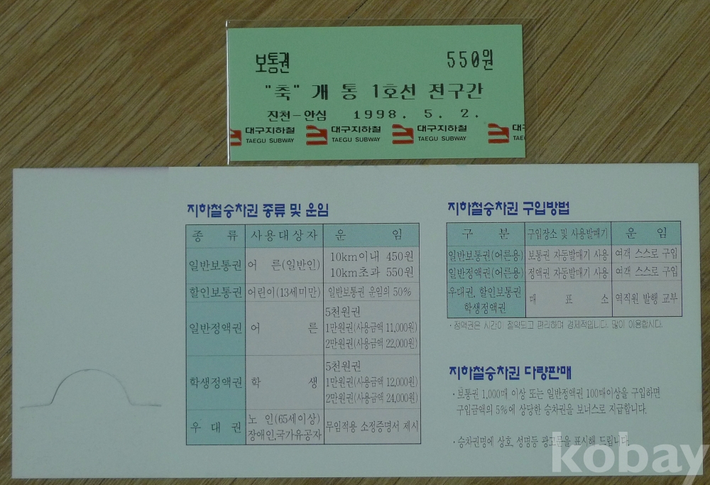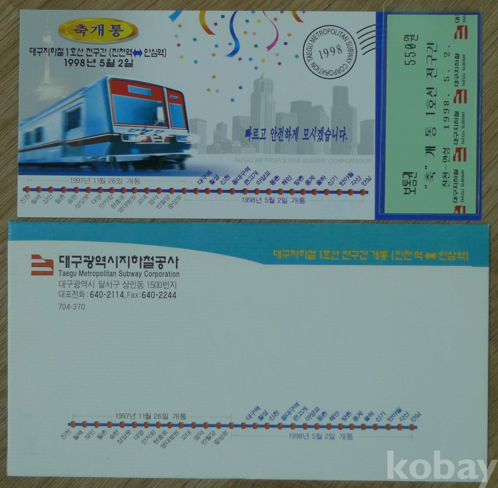 1998년 대구지하철 1호선 전구간(진천역 - 안심역) 개통 기념 승차권
