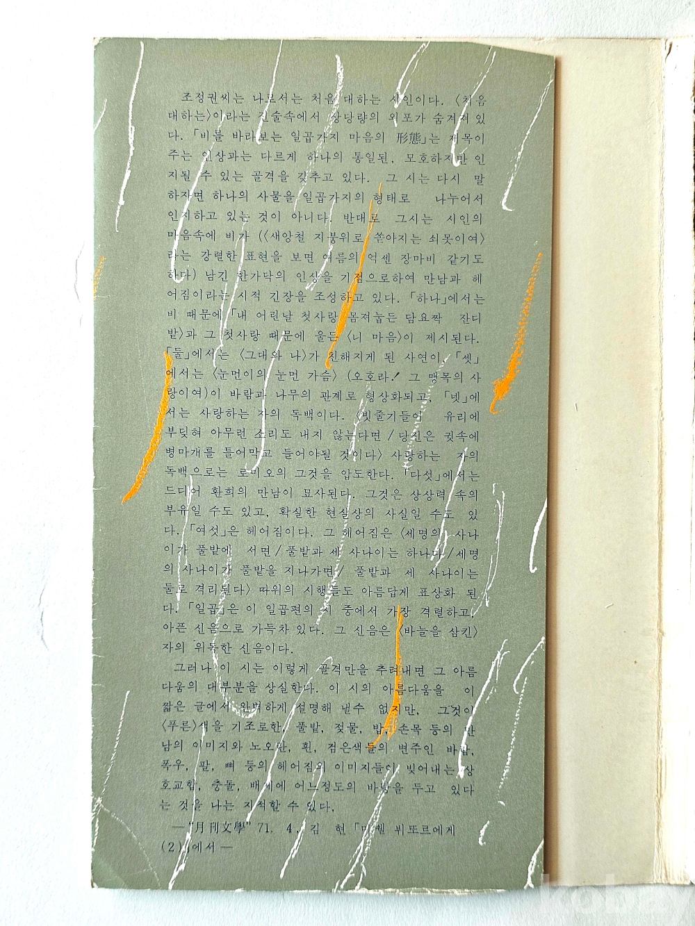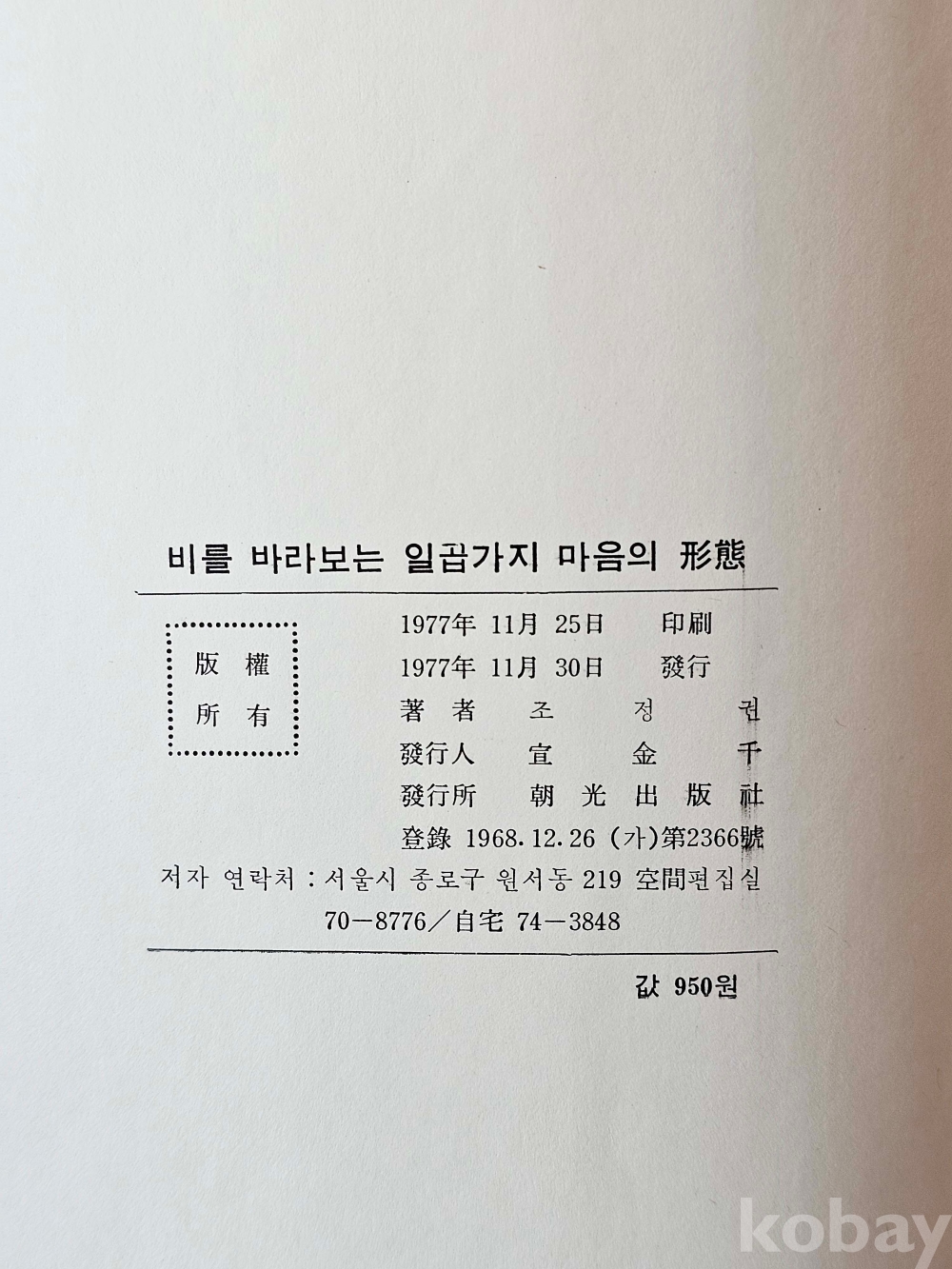 물 품 명 | 비를 바라보는 일곱가지 形態 / 조정권 詩集 / 1977년 초판 / 조광출판사 |
