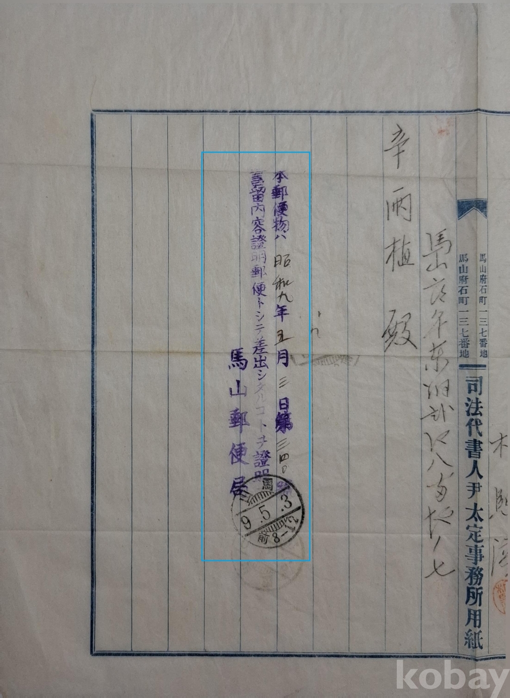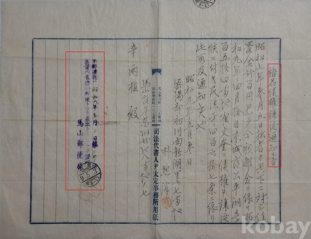 ◈ 왼편에 마산우편국의 내용증명 직인과 날짜가 찍혀 있는 것으로 보아 내용증명 우편으로 발송되었음을 알 수 있다.