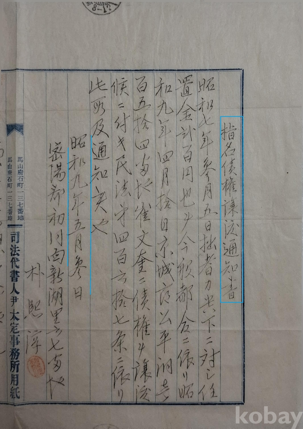 ◈ 소화(昭和) 9년(1934)에 원래의 채권자가 새로운 채권자에게 양도했다는 사실을 통지한 문서.