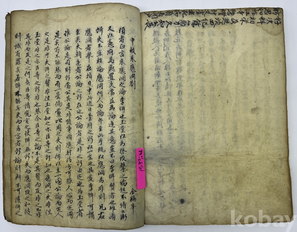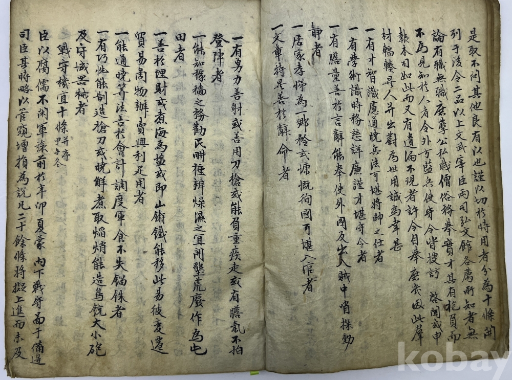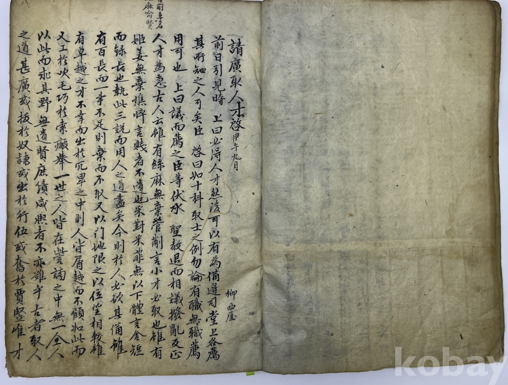 설 명 | 서애(西애) 유성룡(柳成龍)이 1594년 선조에게 올린 상소문인 ‘청광취인재계(請廣取人才啓)’와 산성설(山城說), 임란시 조선의 운명을 갈랐던 조령방의에 대한 통한의 상소문인 ‘조치충주상류차어조령설둔전계(措置忠州上流且於鳥嶺設屯田啓)’, 학이사와주(學以思爲主) 등 많은 분량의 글이 수록되어 있다. 여기에는 정경세의 추모글과 이호민의 제문에 이어 중간에 미수 허목의 ‘비망기(備忘記)’와 ‘왕세자상소’ 등 몇장 분량이 있고 김안국의 ‘경민편’에 이어 학봉 김성일의 신구송응함차(申救宋應浻箚) 등의 글도 있다. 표지 제목은 ‘문견록(聞見錄)’이다. 물품번호 : 58 | |||||