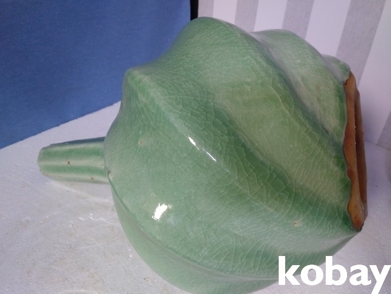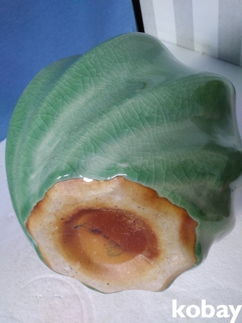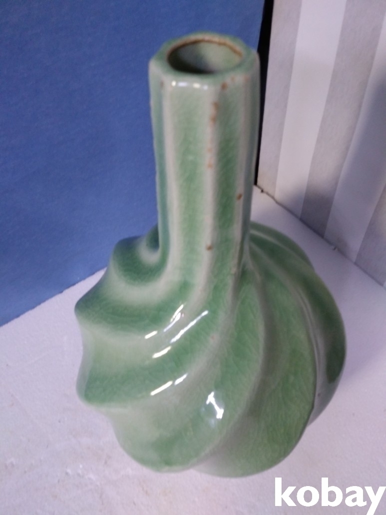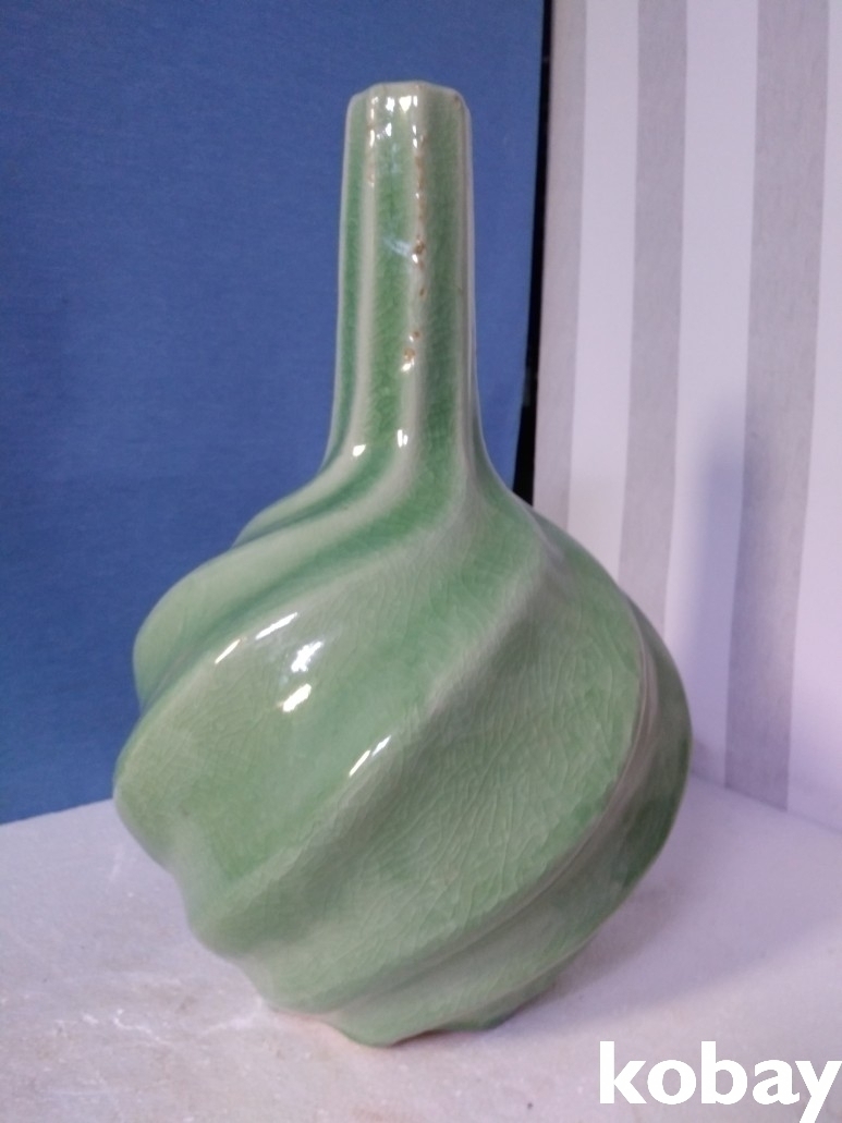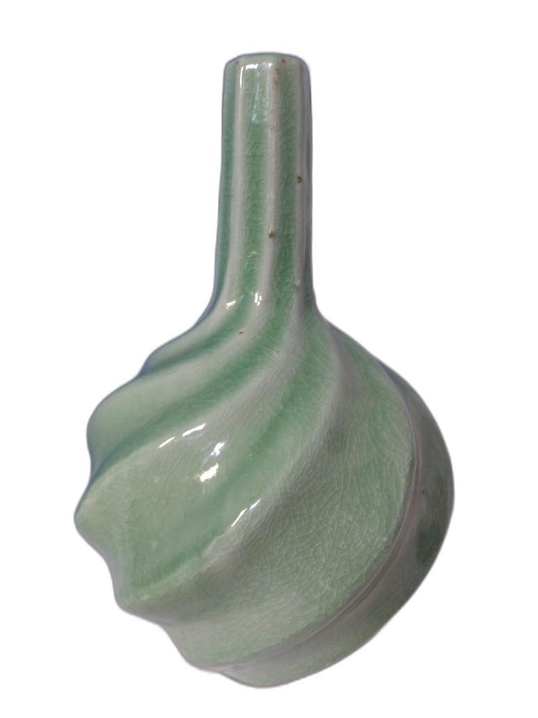 회오리 모양의 골이 있는 목긴 도자기 입니다.