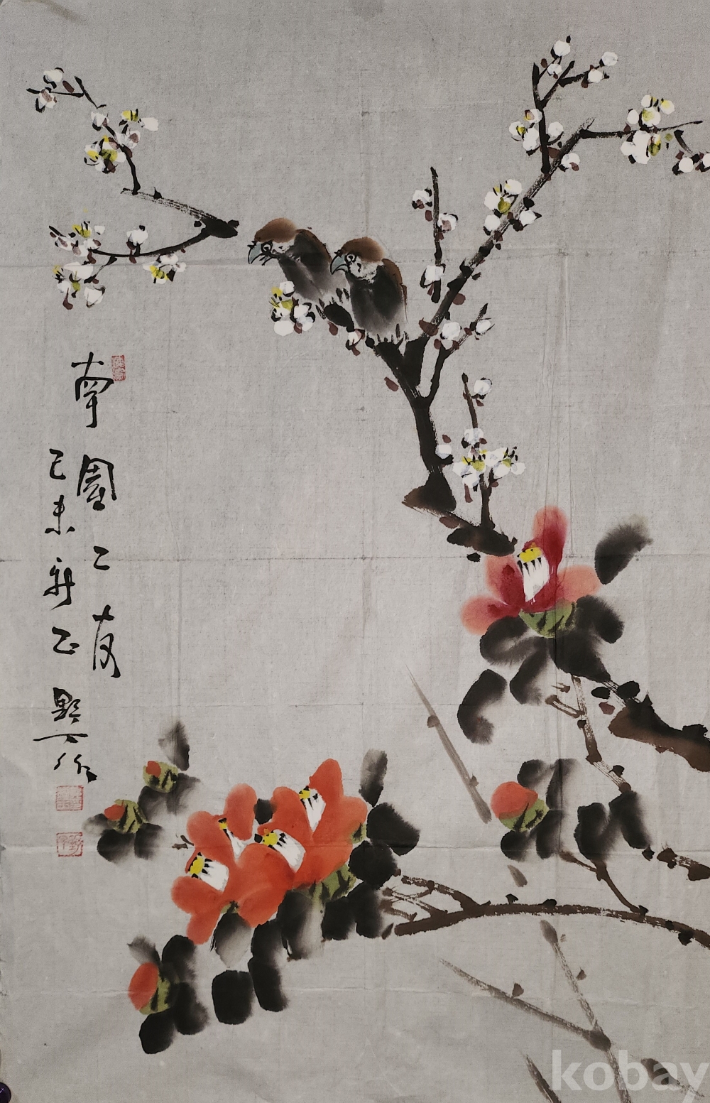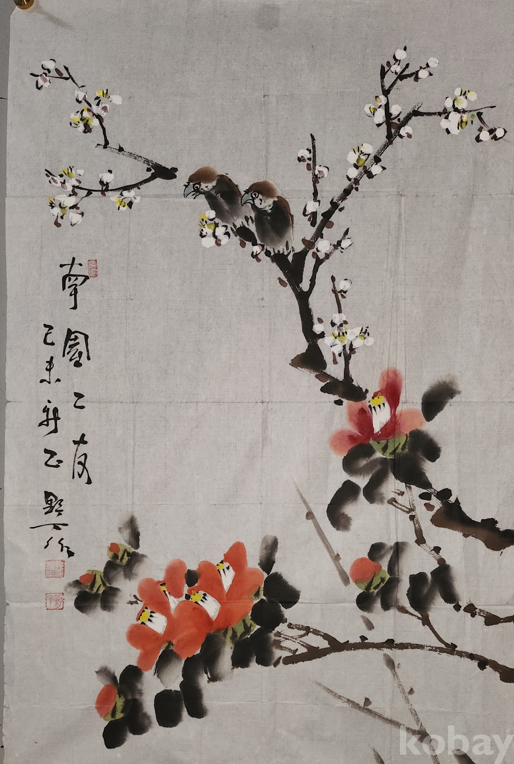 종이에 채색한 동백과 매화 그림입니다,