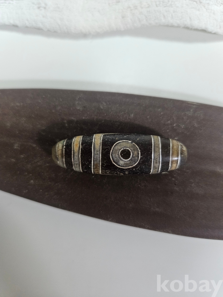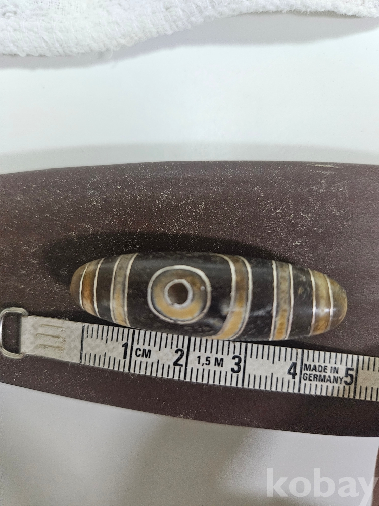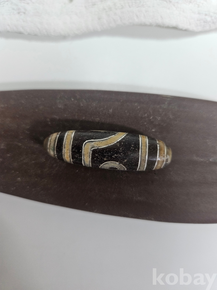 고급스러운 갈색과 황색의 천연 무늬 위에 은빛 상감이 정교하게 새겨진 **2눈 티벳 천주(Dzi Bead)**입니다.