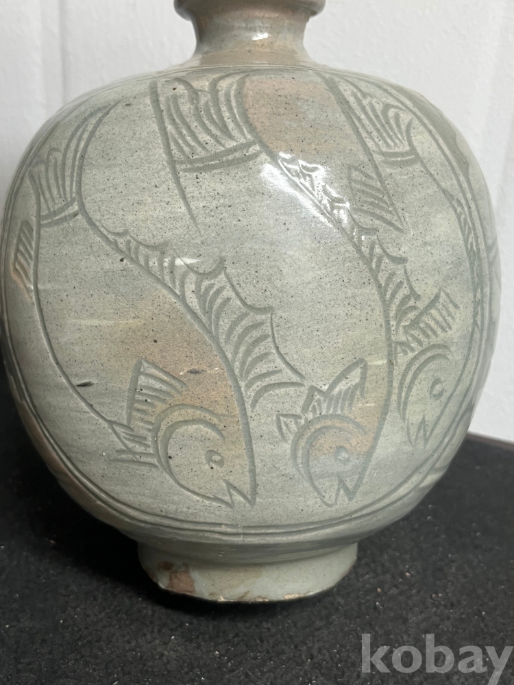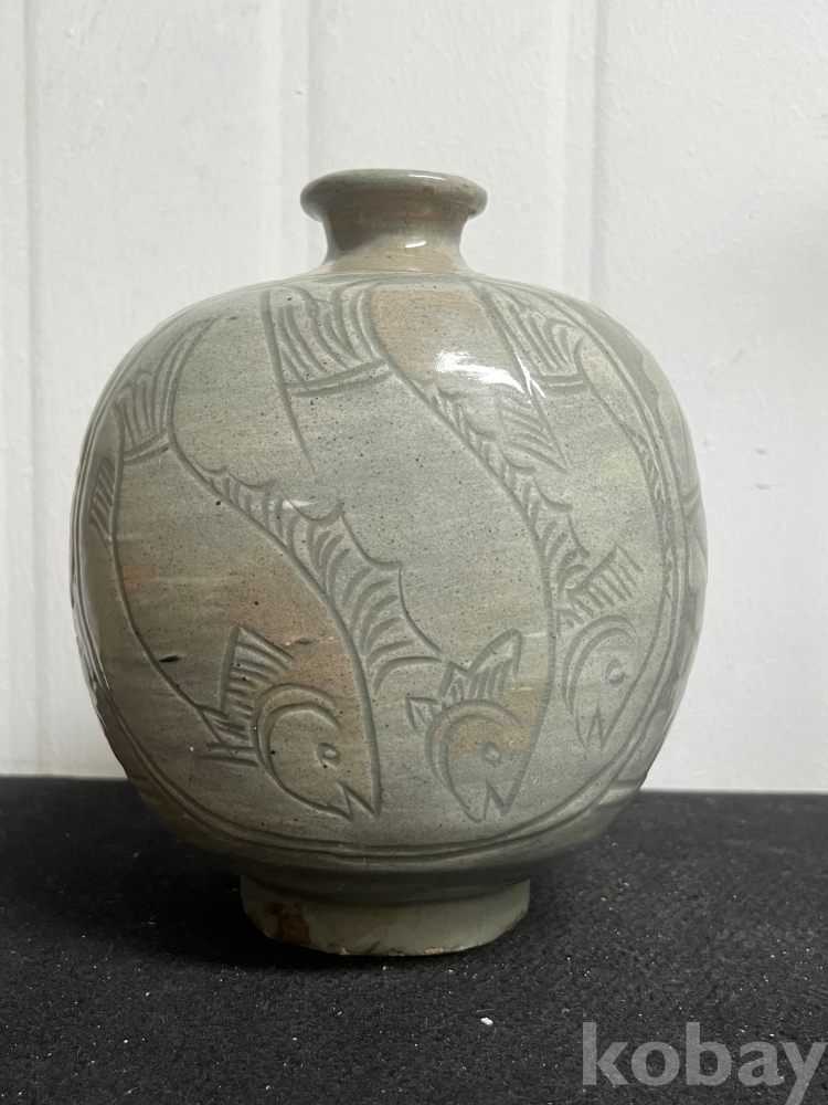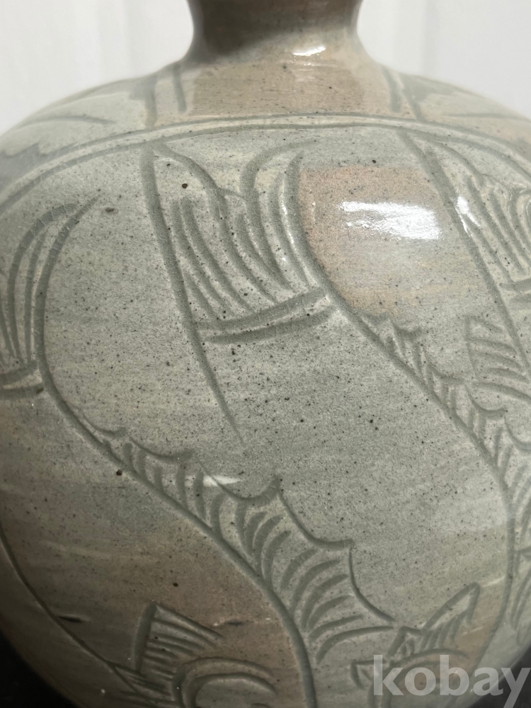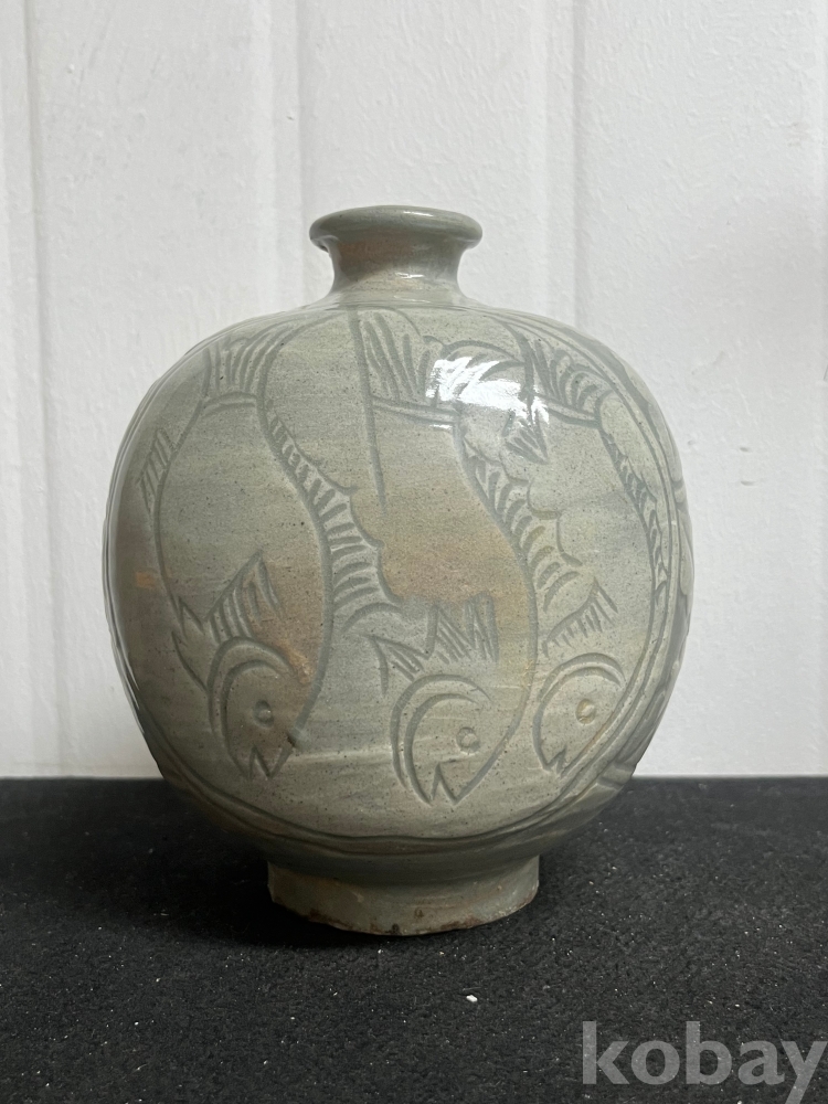 분청사기 어문병입니다. 자유로운 음각 기법으로 표현된 물고기 문양이 유려하게 펼쳐지며,