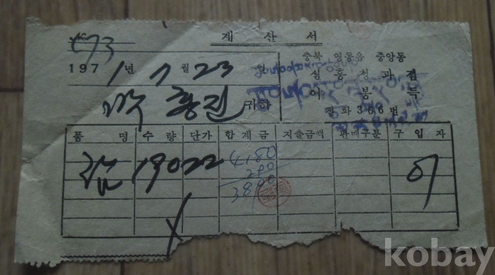 1971년 영동읍 영동청과상회 발행 계산서