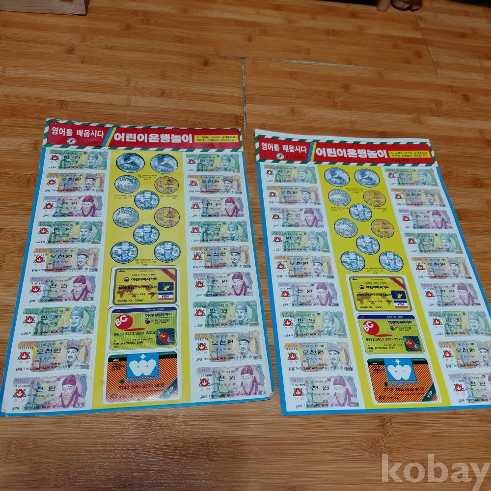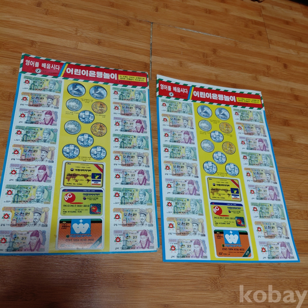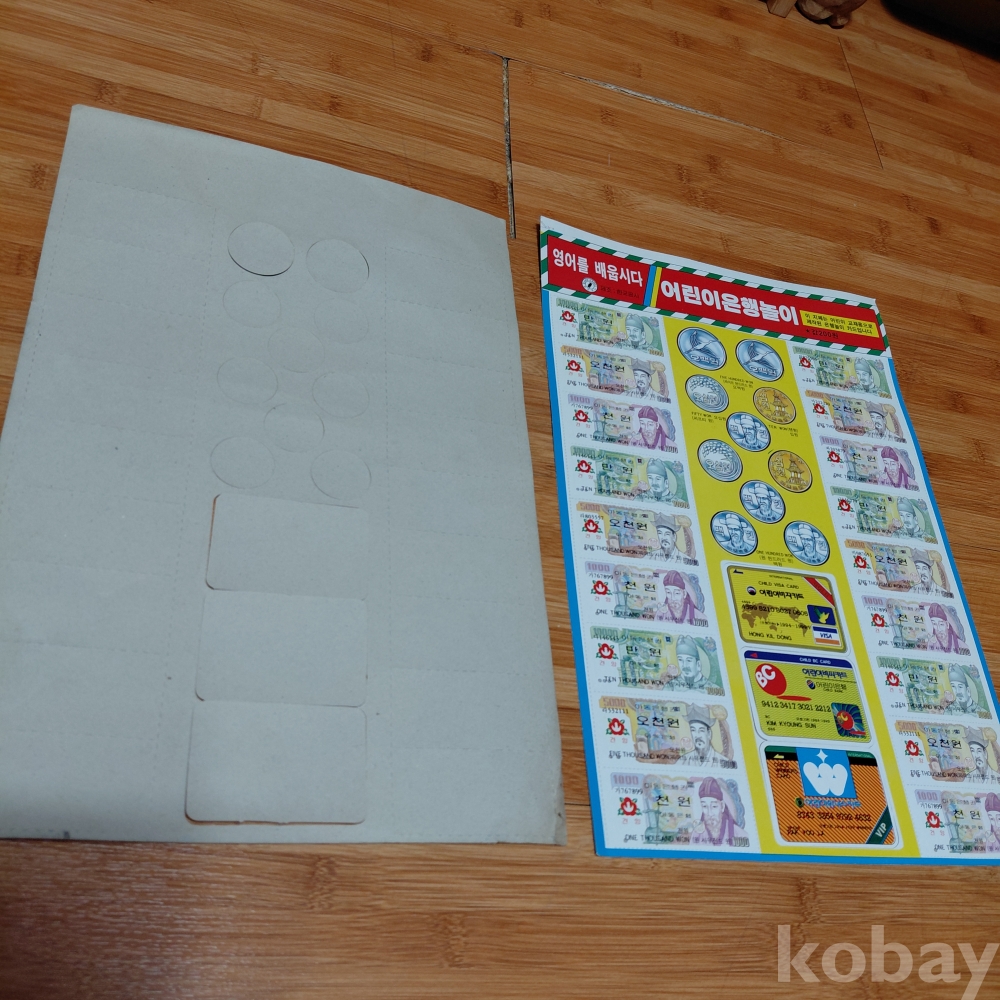 근현대사 80ㅡ90년대 어린이 은행 놀이 두장일괄 한장 뒷면 떨어진곳있음 투명테입 작업필요