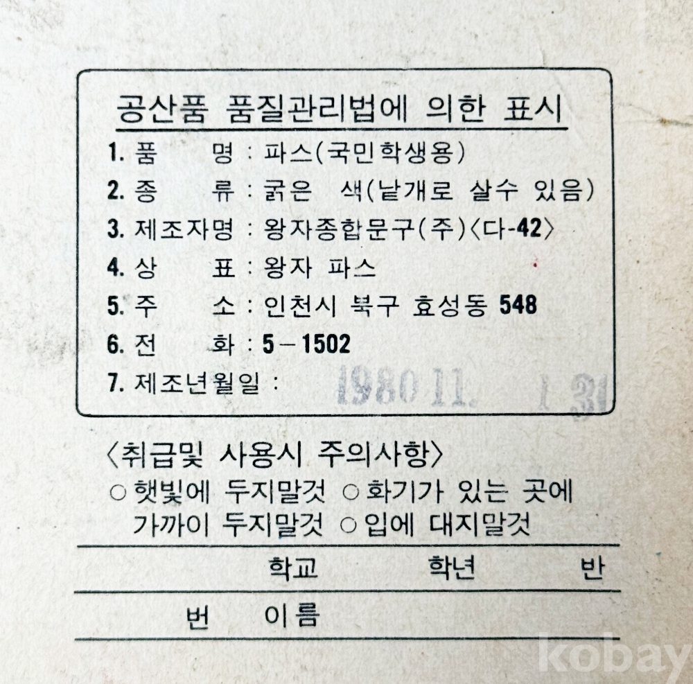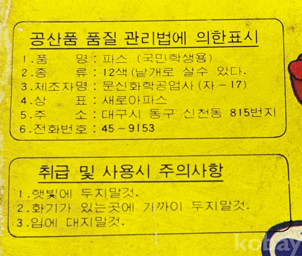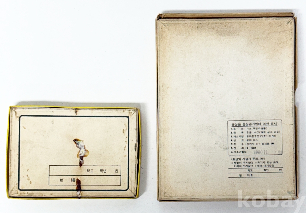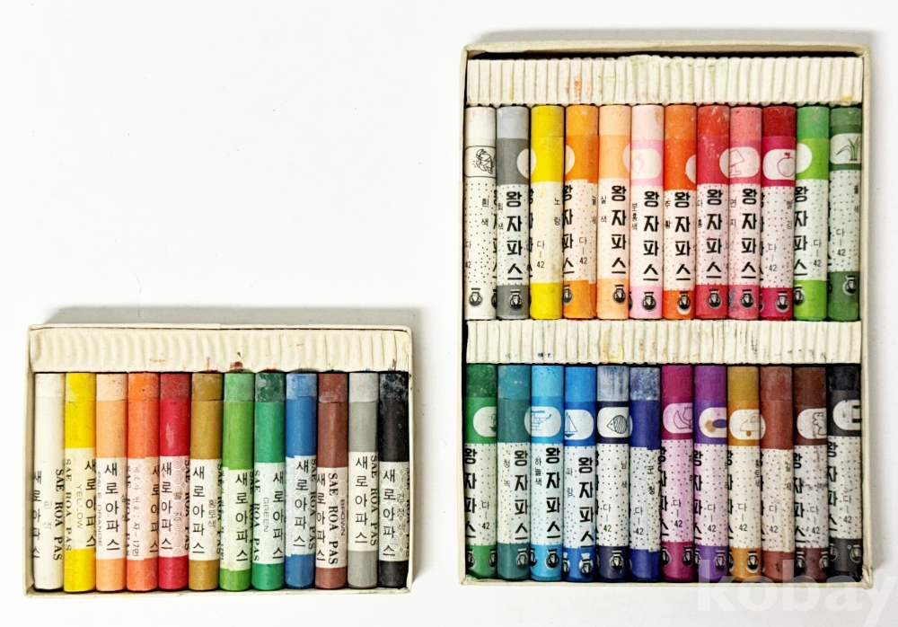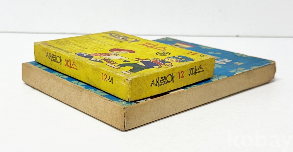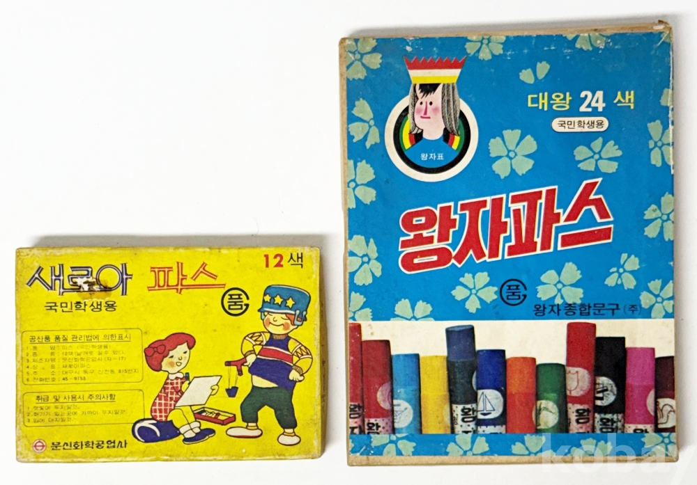 상품설명 | 1. 국민학생용 새로아 파스 12색 / 문신화학공업사 / 박스 밑면 오염 / 12.7 x 9 cm 2. 국민학생용 왕자파스 대왕24색 / 왕자종합문구(주) / 13.5 x 17.7 cm | ||