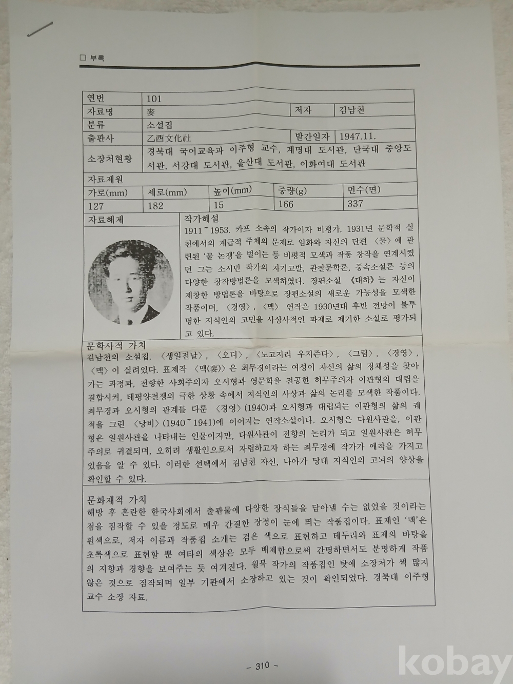 제목 : 맥 (김남천의 창작집)