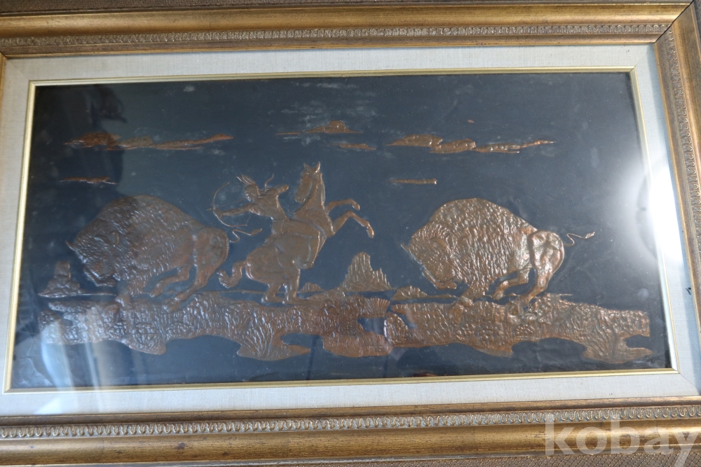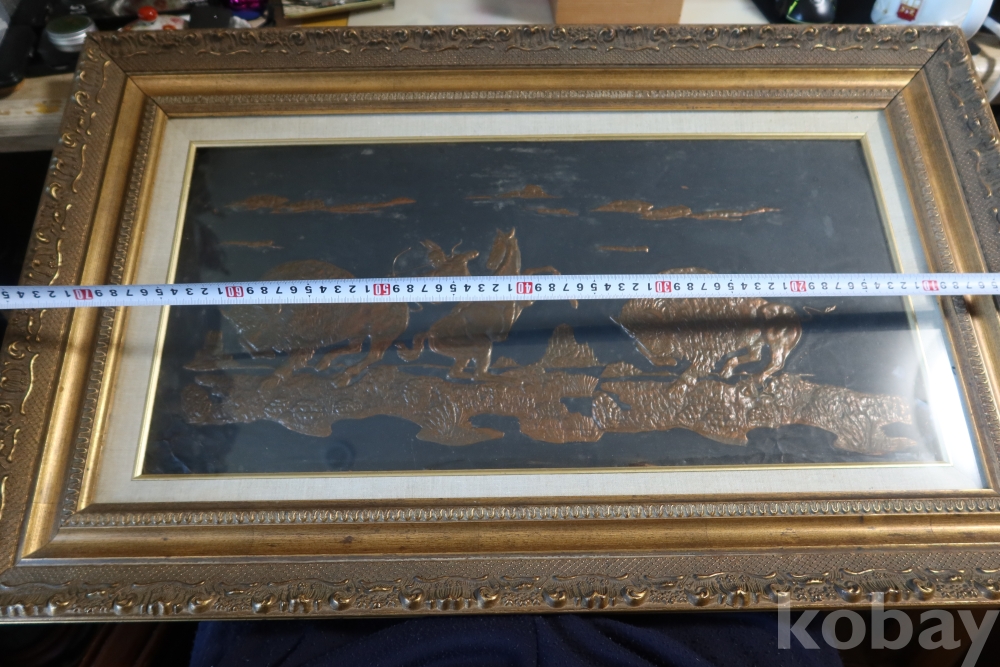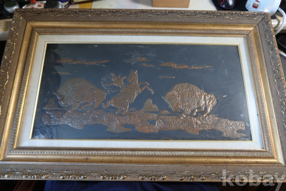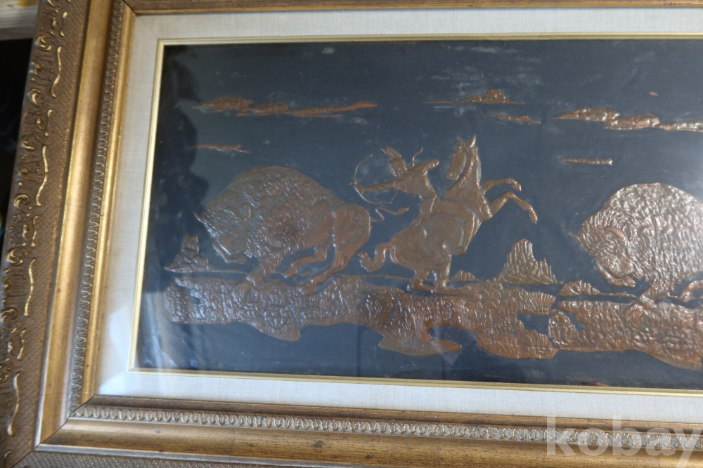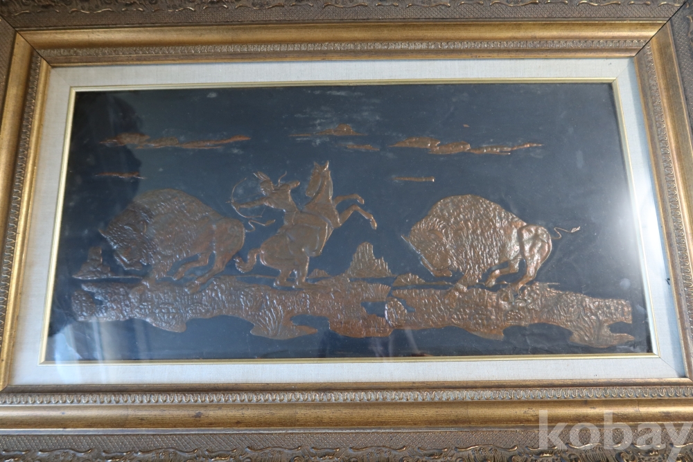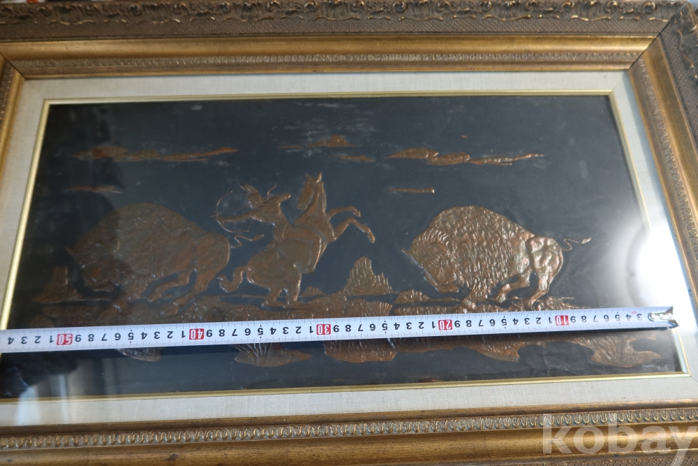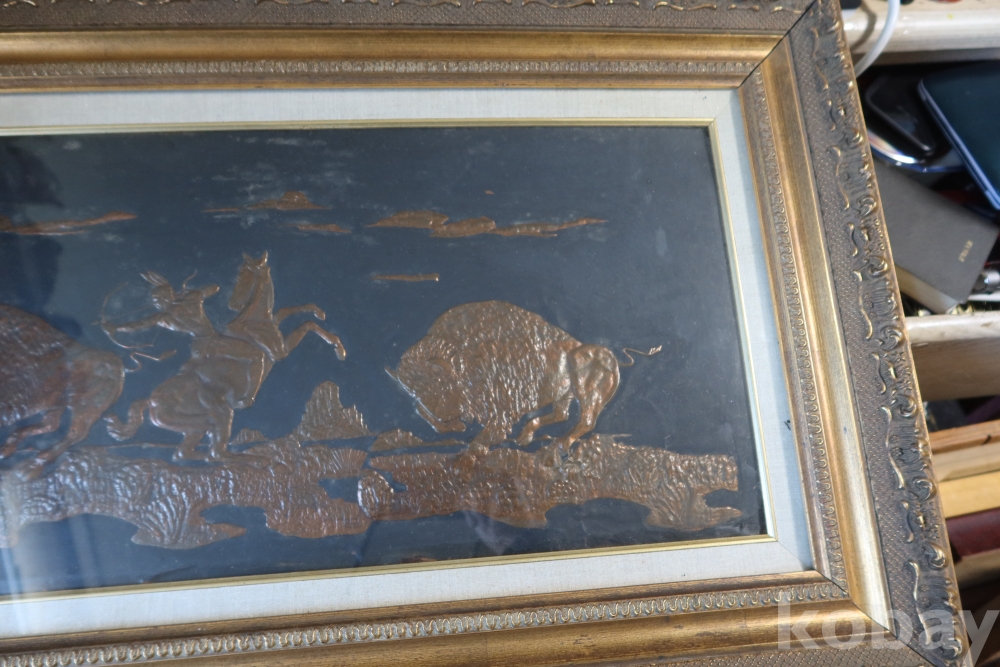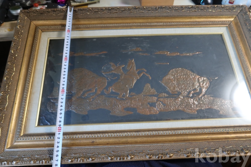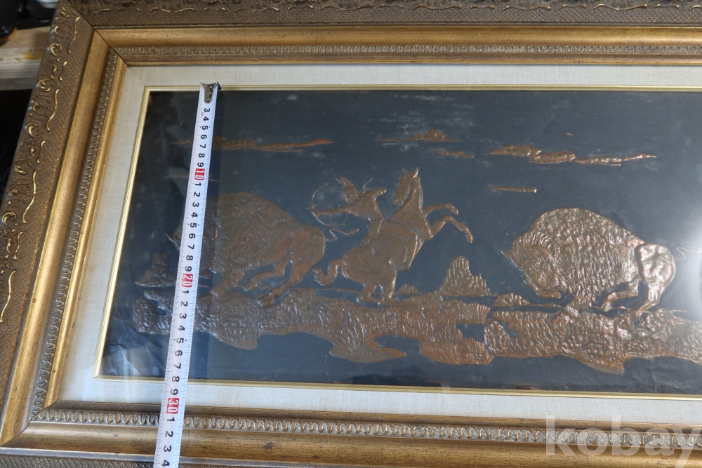 들소 사냥 구리 금속 공예품 이며 고급 액자를 가진 명품 이며 액자 등등 고 태미를 가진 명물 임니다 금속 미국 구입 인 명품 임니다 빛 반사가 보임니다 낙찰시 유리 없이 배송 함니다