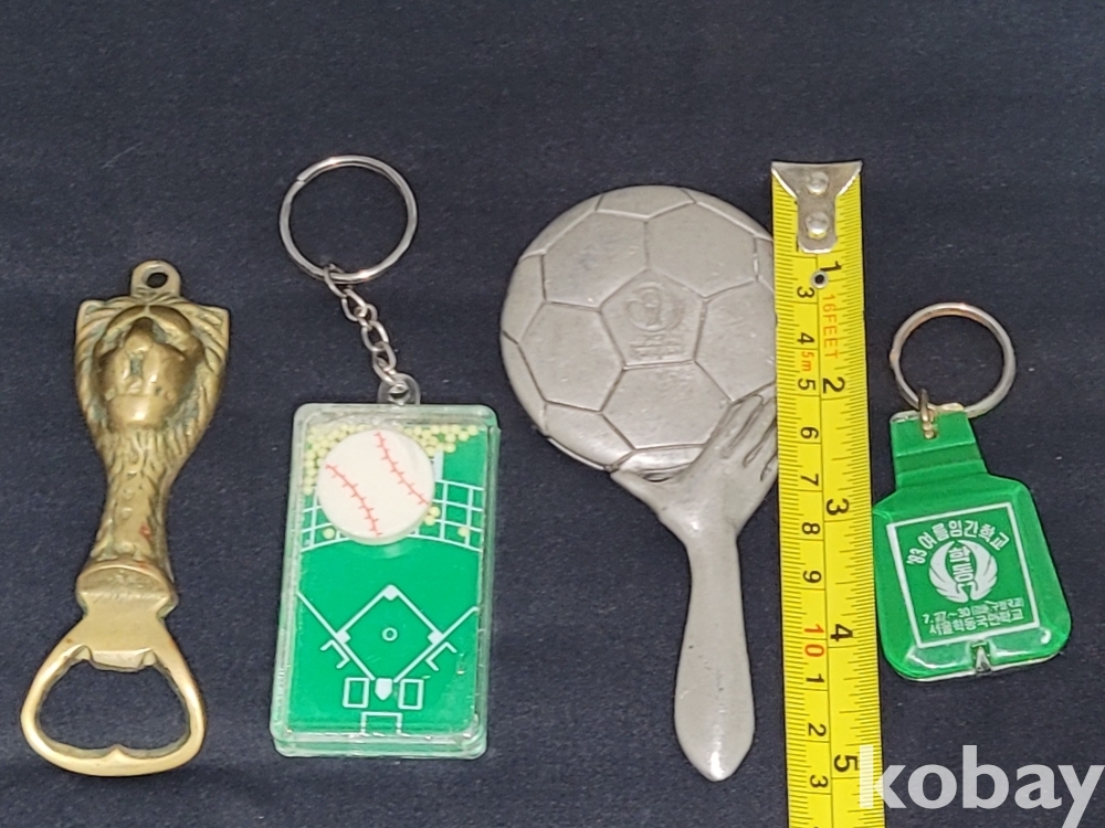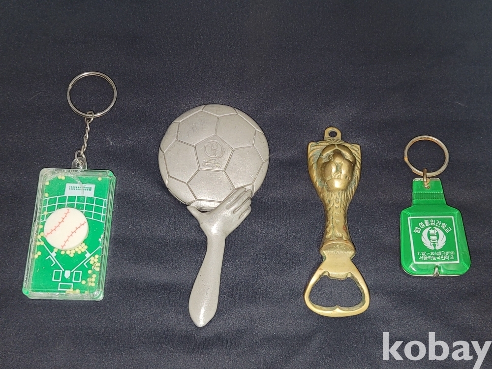 빈티지 세월 감이 느껴지는 1983년 열쇠고리 병따개, 2002년 한일월드컵 주석 손거울, 야구장 열쇠고리, 사자 병따개 등 4종 일괄입니다.