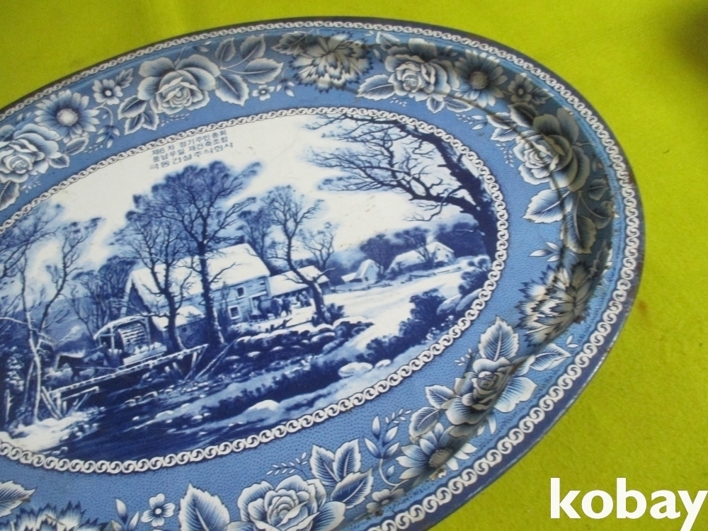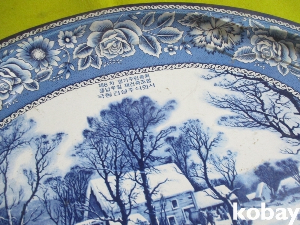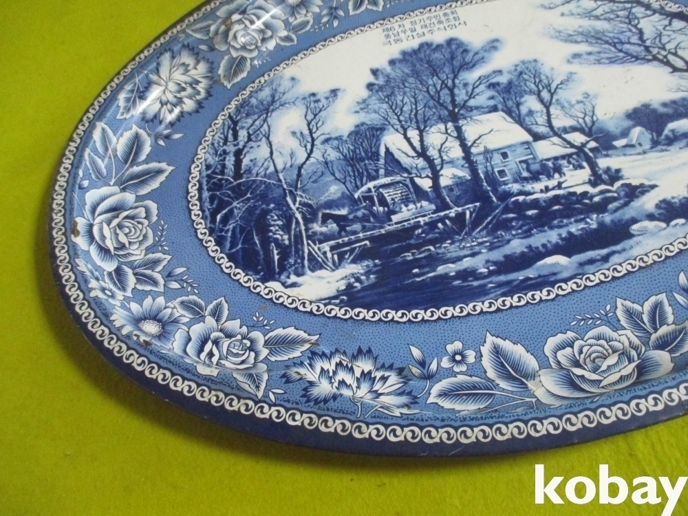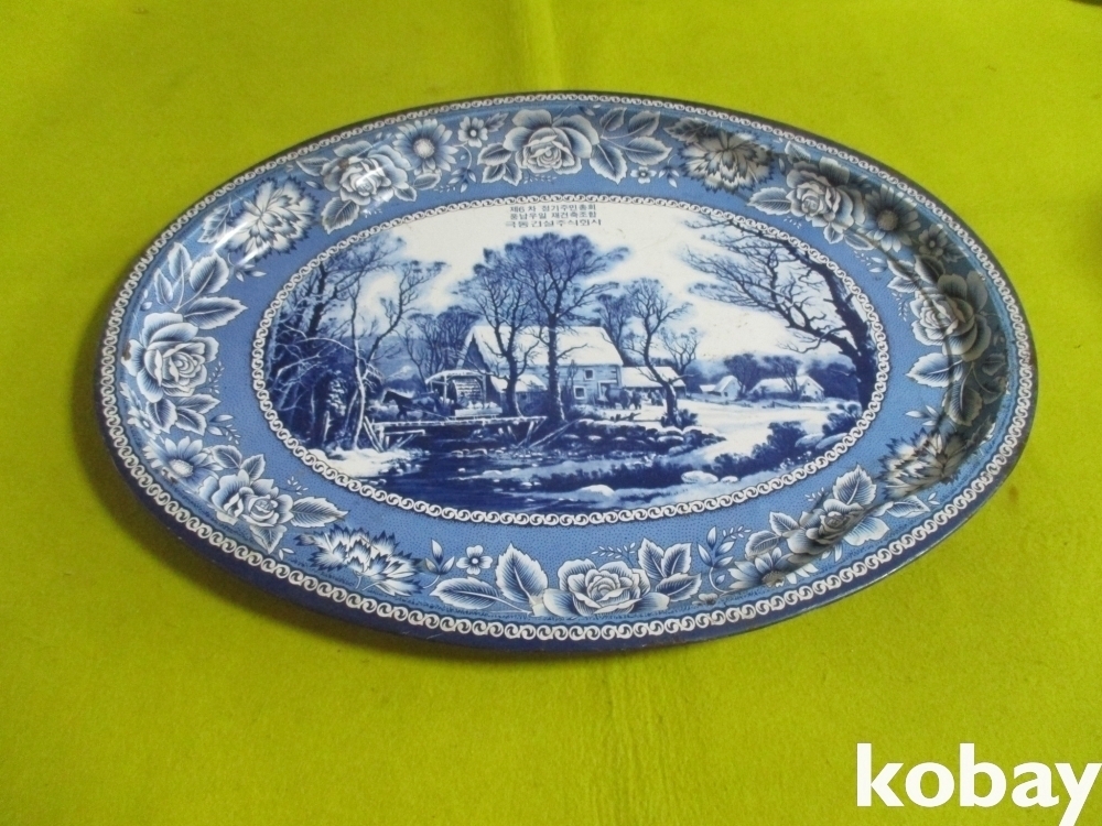 (((근현대사자료))) 오래전 전원풍경모습이 이국적인 꽃문양 대형 틴 쟁반 (극동건설주식회사)