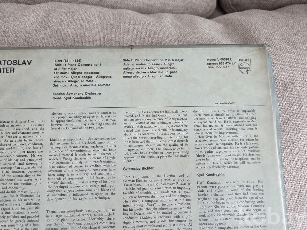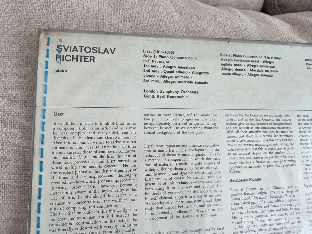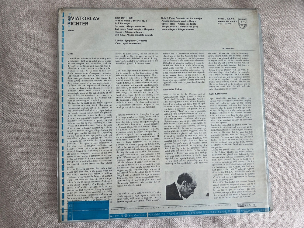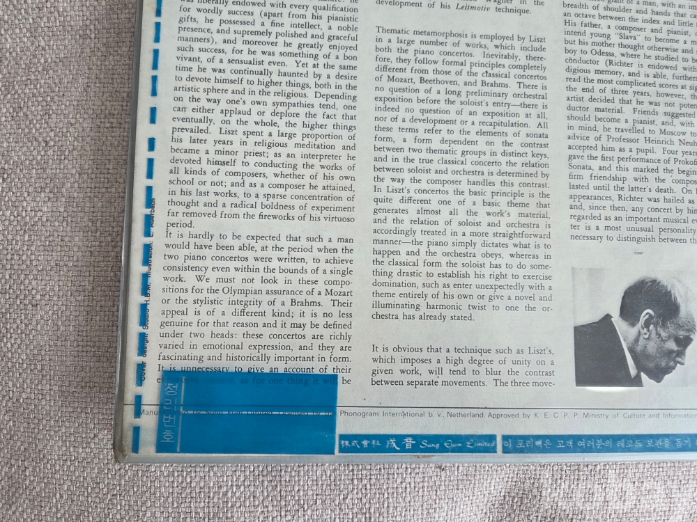 전설적인 피아니스트 스뱌토슬라프 리흐테르(Sviatoslav Richter)가 연주한 프란츠 리스트(Franz Liszt)의 피아노 협주곡 1번과 2번 음반입니다.