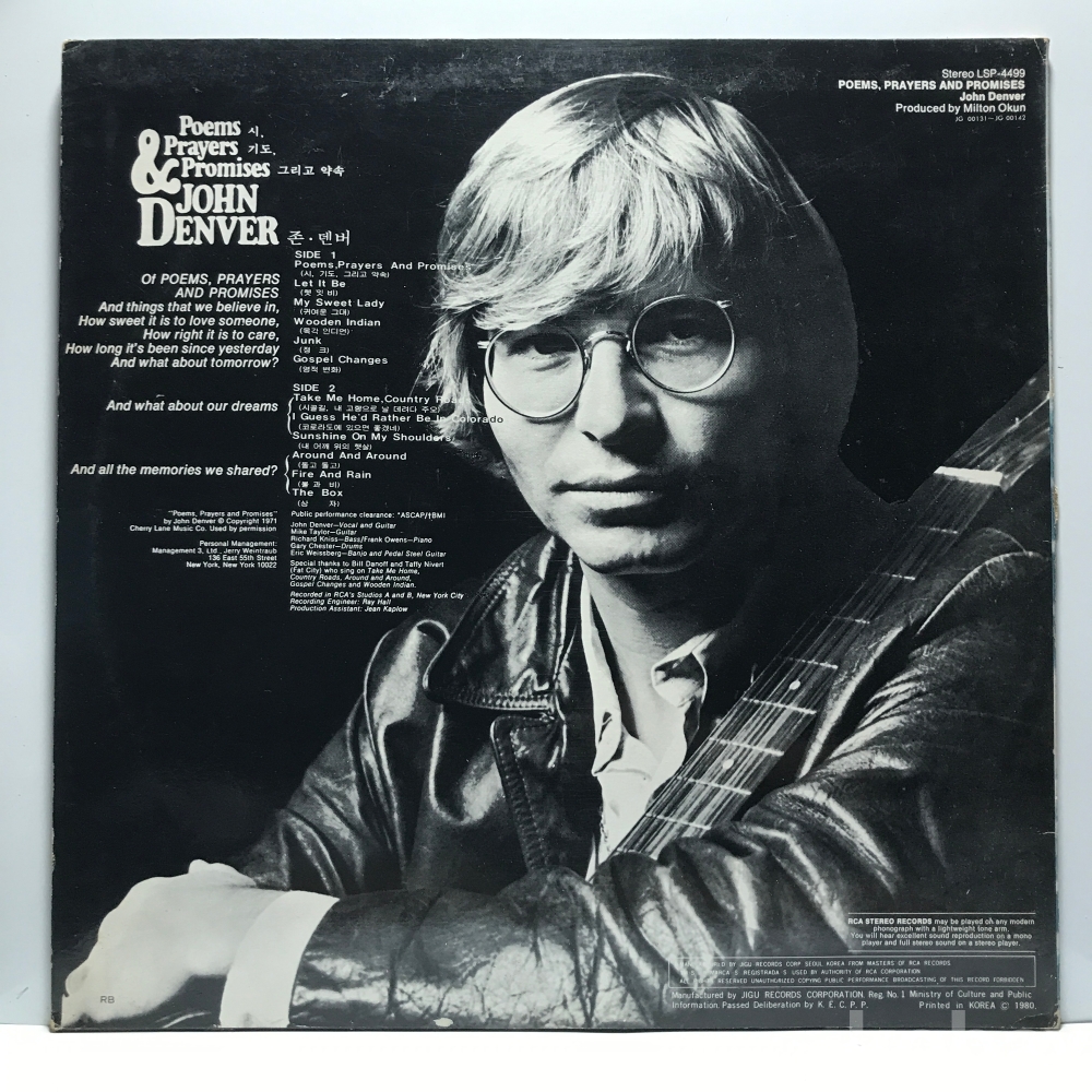 LP 22,480-10 John Denver - Poems, Prayers & Promises _ 자켓 EX- 알판 EX 80 년 국내반