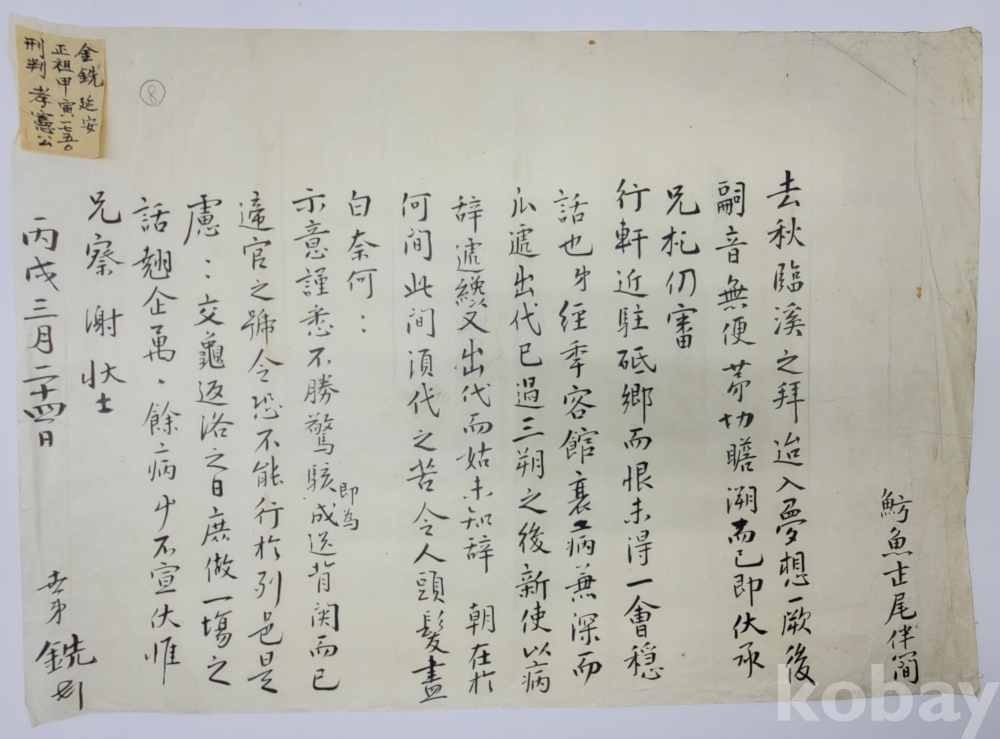 첫 번째 편지는 김선이 1826년 음력 3월 24일에 지인에게 쓴 감사 답장이다. 물목에 ‘방어(魴魚)’가 적혀 있다.