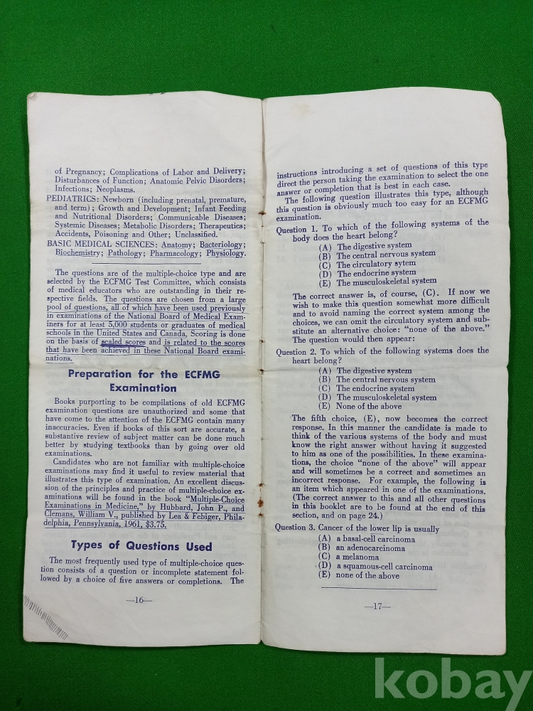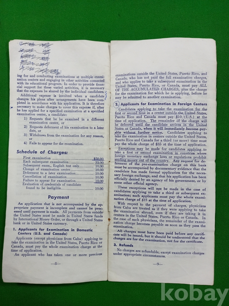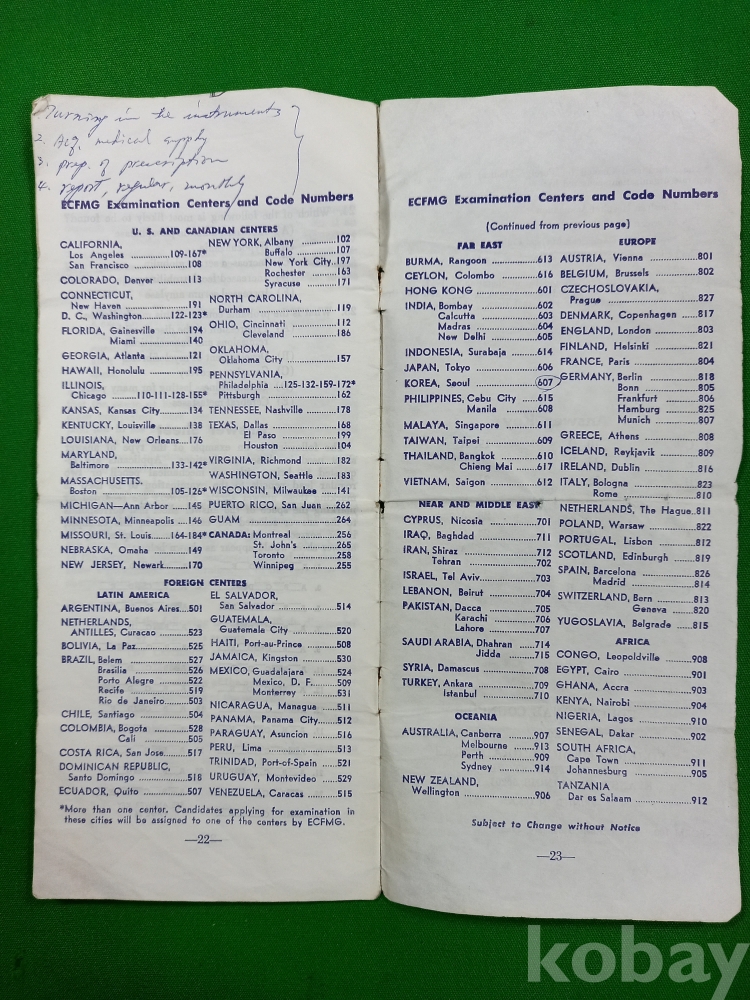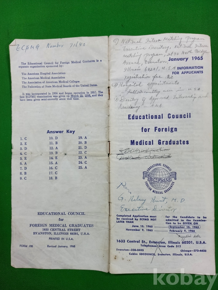 1965년 당시 미국에서 활동하고자 하는 외국 의대 졸업생들을 위해 외국 의대 졸업생 교육 위원회(ECFMG)가 발행한 안내 책자 및 신청서입니다.