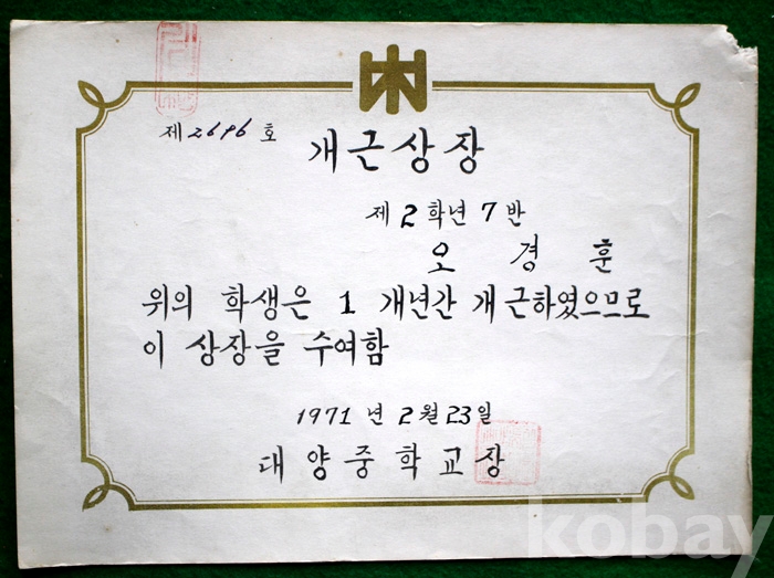 (상장 및 졸업장) 1971년 대양중학교의 개근상장 ...