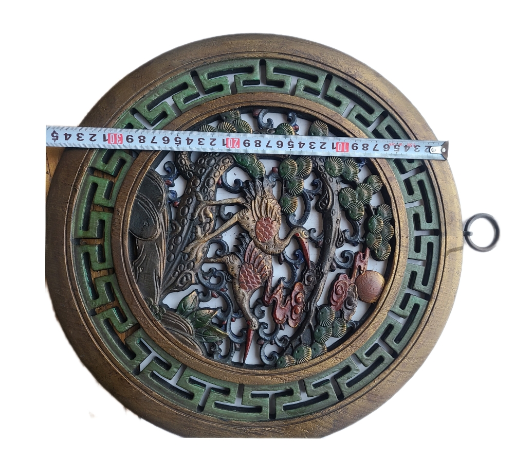 본 상품은 정교한 조각과 다채로운 채색이 돋보이는 고풍스러운 원형 목조 문 장식품입니다. 과거에는 대문이나 방문 등에 부착하여 장식성과 길상(吉祥)의 의미를 더하던 용도로 사용되었을 것으로 추정됩니다.
