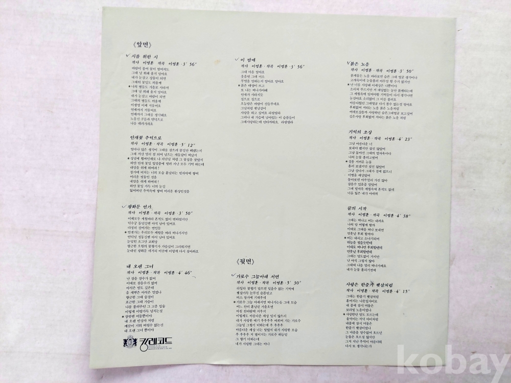| 자켓상태 | EX : 약간의 마모, 모서리 찢김 존재 | 음반상태 | EX : 재생에 영향 없는 가벼운 기스 존재 | 발매정보 | 초반 | 가사지여부 | 유 |