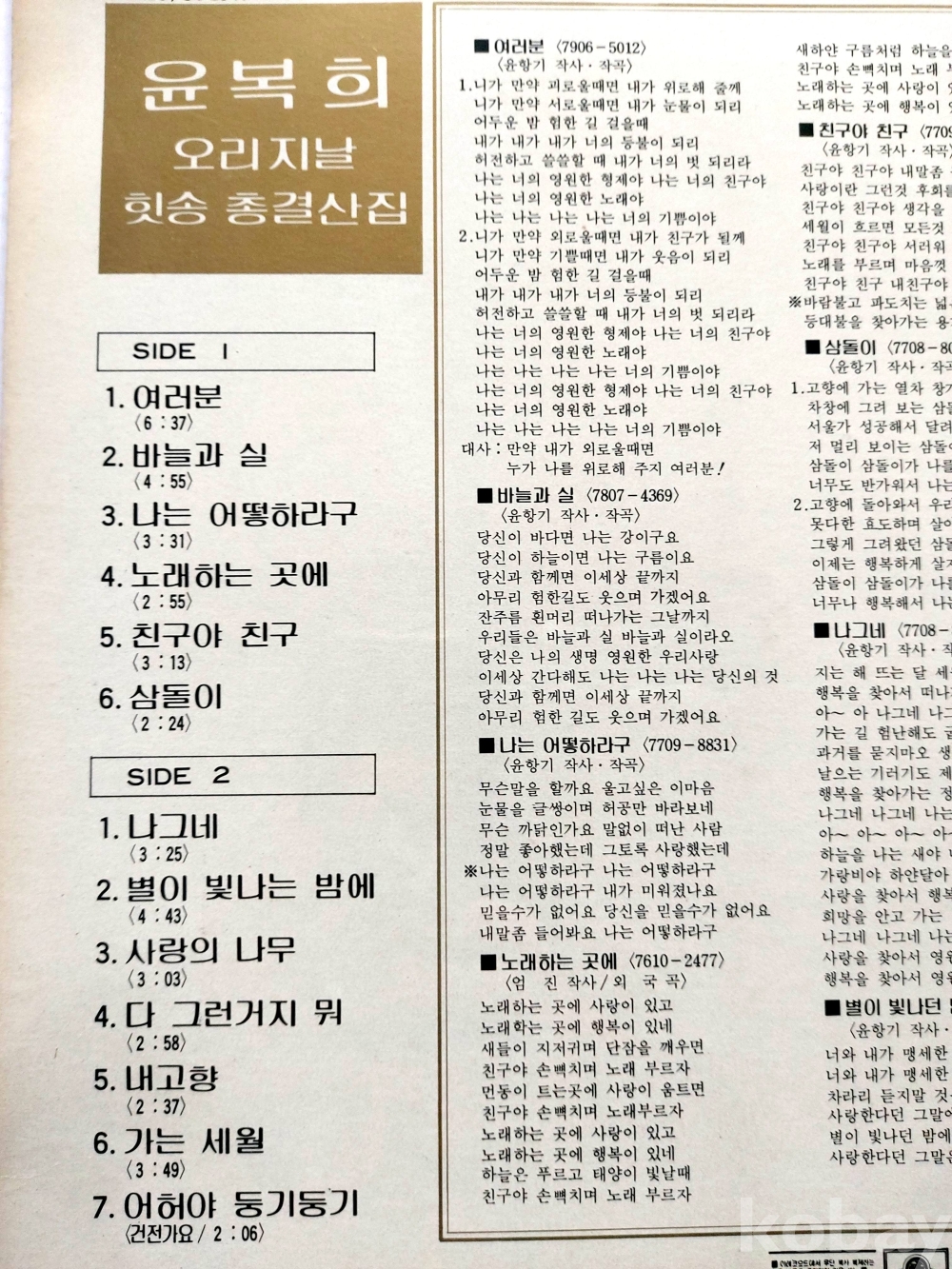 < LP음반 / 윤복희 오리지날 총결산집 (여러분/나그네/별이 빛나는 밤에) >