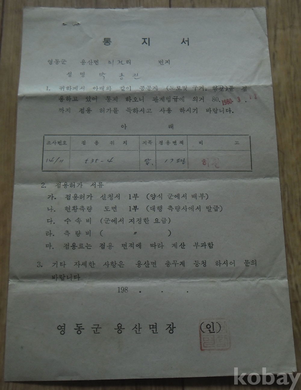 1980년 하천점유 사용 통지서(영동군)