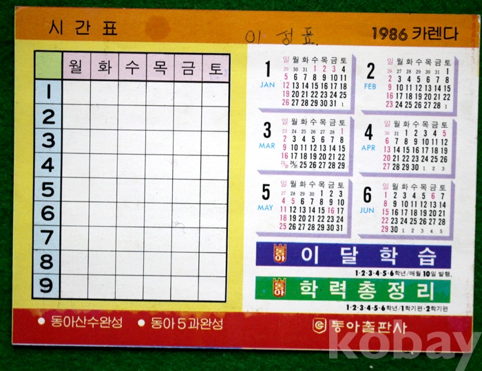 1986년 동아출판사의 홍보 시간표 및 카렌다 ...