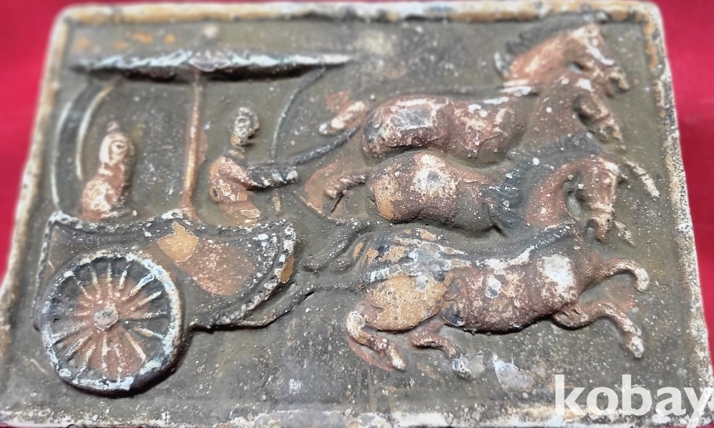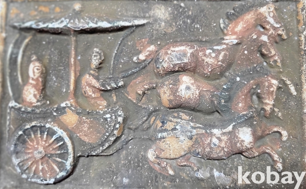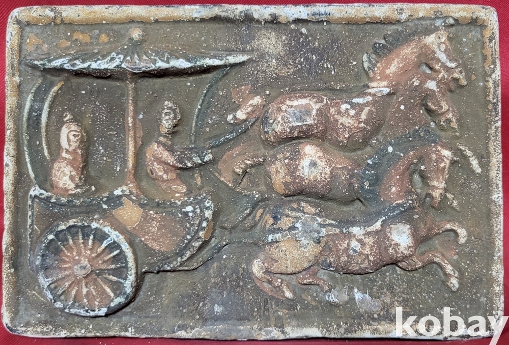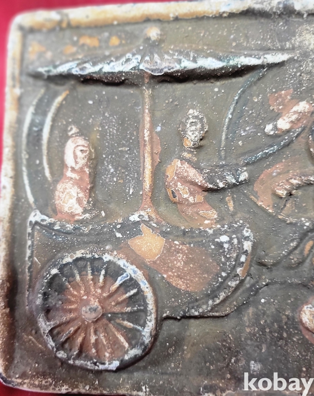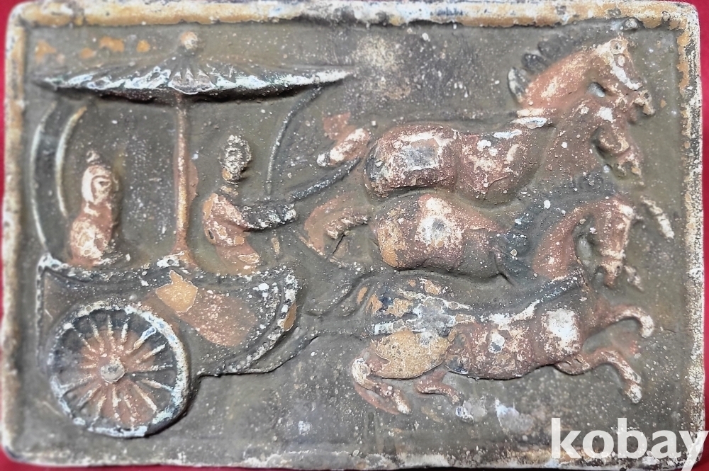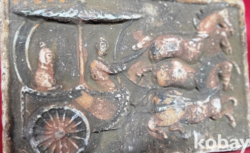 짱짱한 연대 갖춘 당채로 마감된 마차와 인물 문양 전돌입니다,