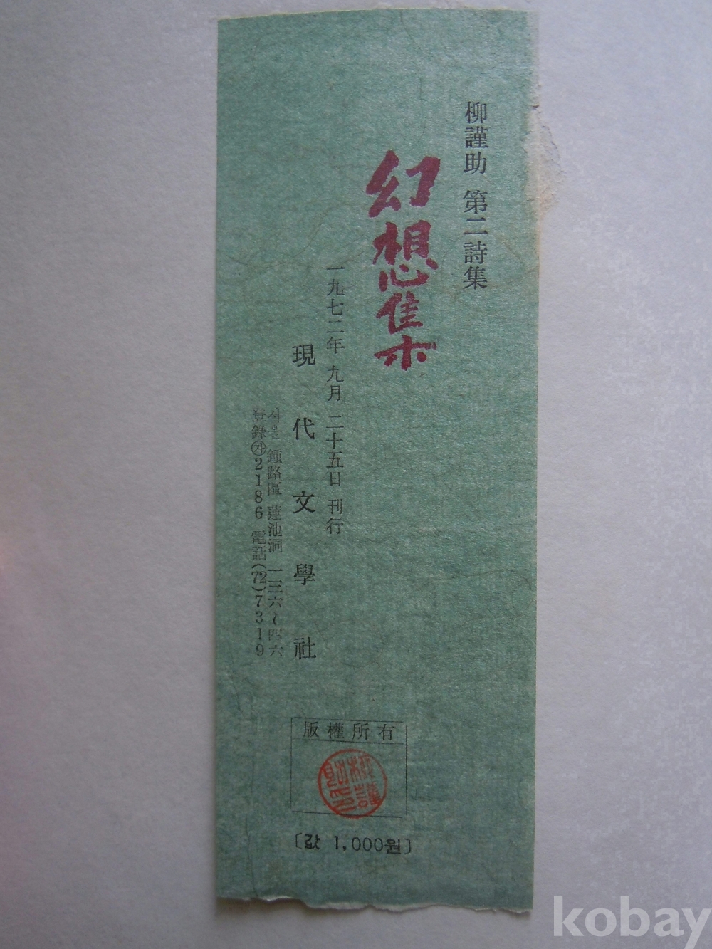 환상집(천경자 화백 표지, 속표지 그림, 김광섭 시인 제목 글씨, 저명한 시인께 증정한 저자 친필 붓글씨) / 유근조 / 1972년 초판본 / 현대문학사 / 큰판형 130쪽 / 귀한 시집 / 매우 좋은 상태 /