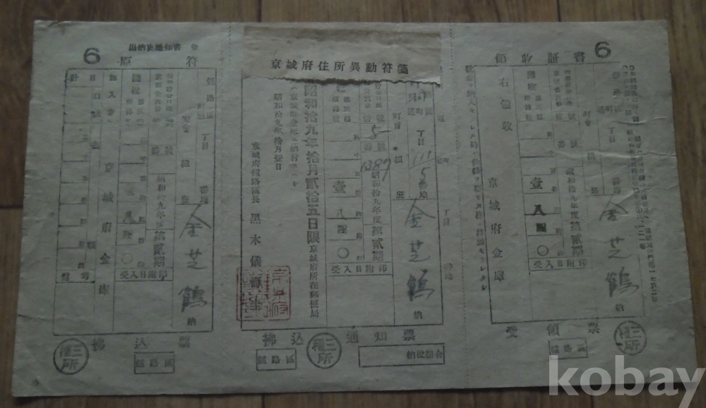 소화19년 경성부금고 주소이동자 납부금 통지서
