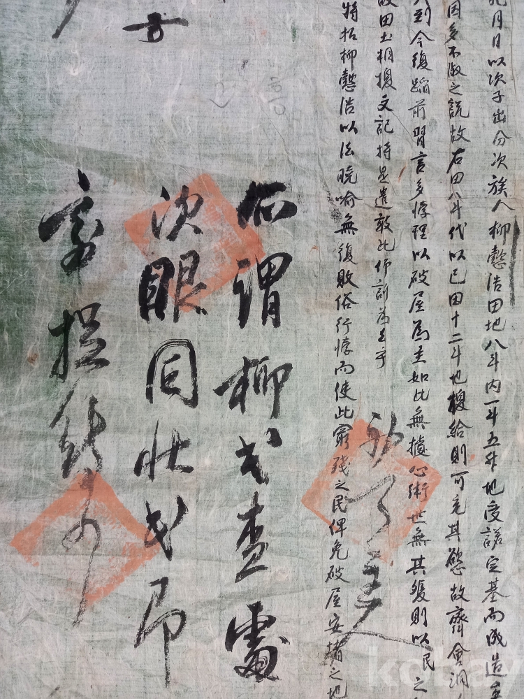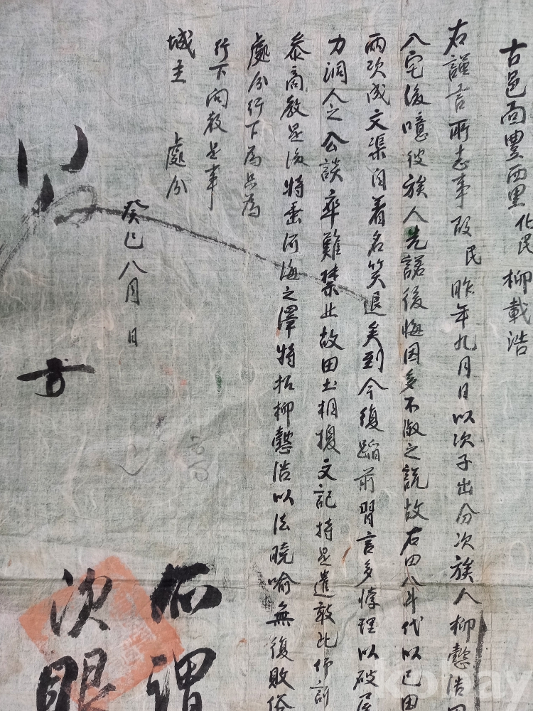 관청의 처분 (제사): 문서 왼쪽 하단에 큰 글씨로 쓰인 부분과 붉은색 수결(서명)은 민원을 접수한 관청에서 내린 판결이나 지시 사항인 제사(題辭)입니다.