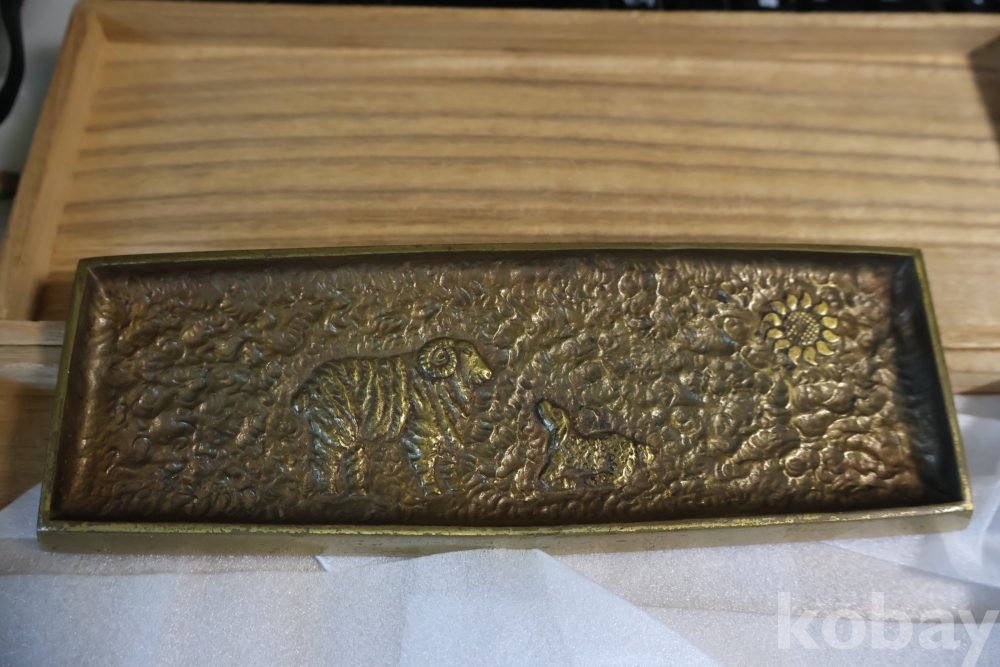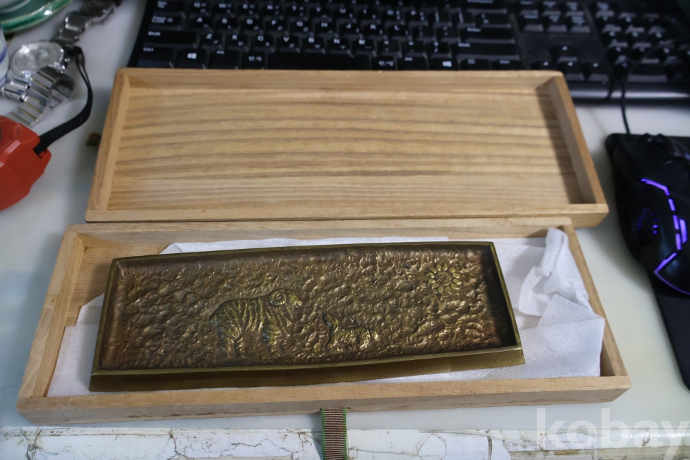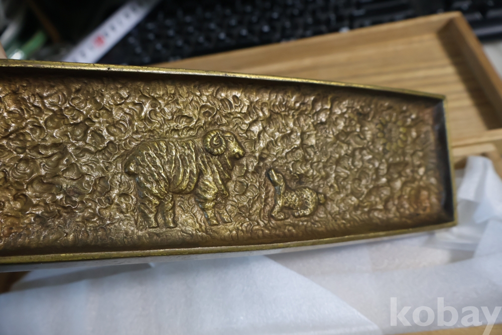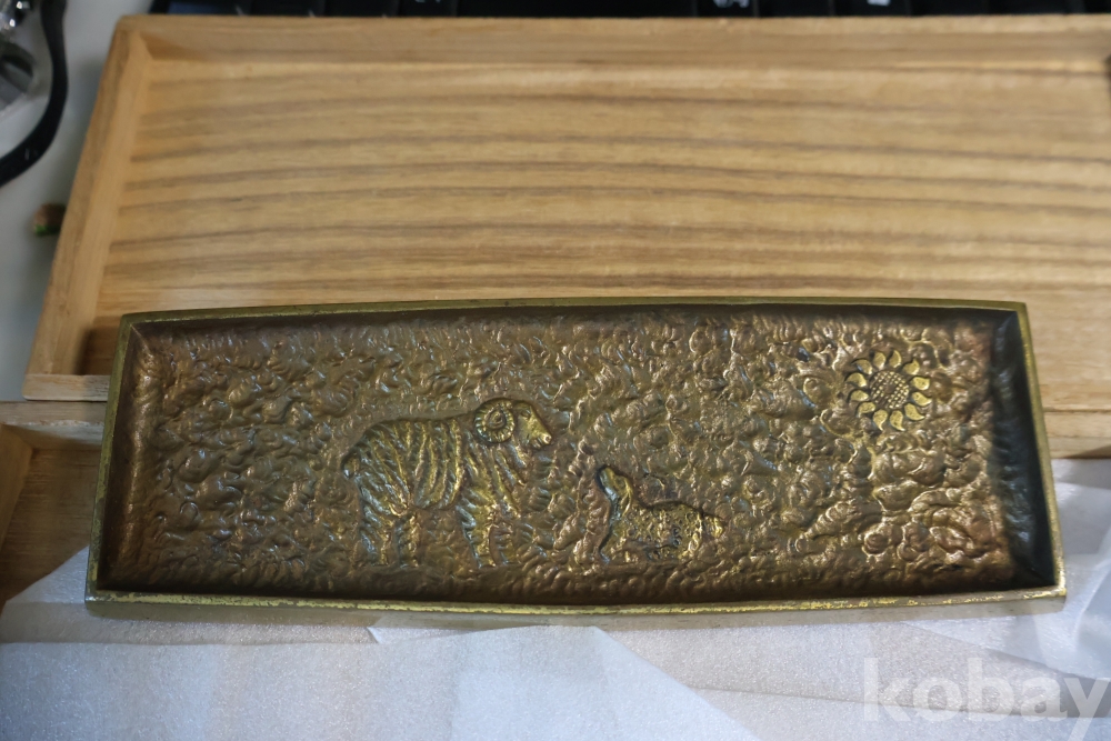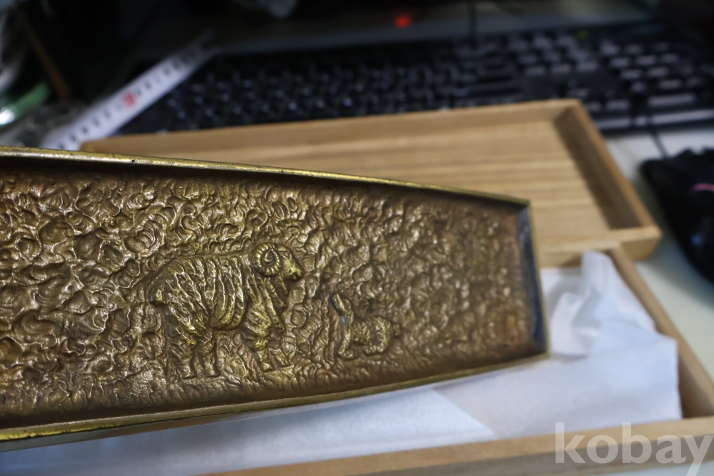 황동 임니다 조각가의 효 삼 자를 가진 낙관이 보이는 현대 공에품 이며 나무상자에 보관해온 명품 이며 사이즈에 비해 무개감을 가진 명물 임니다 양과 태양 시리즈로 유명한 조각가 임니다