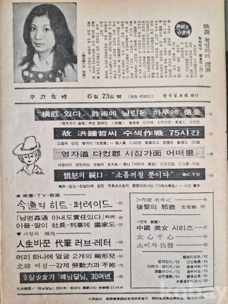 [희귀 근대사 자료] [주간 여성] / 1974.6.23일 / 표지 탤런트 양정화