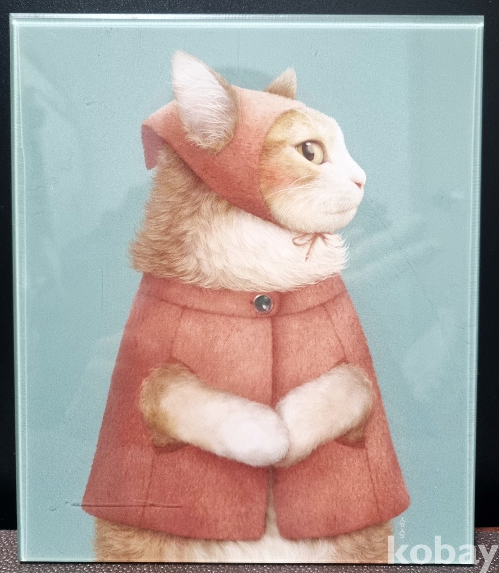 연한 청록색 배경 위에 망토와 모자를 착용한 고양이 캐릭터가 측면을 바라보는 구도로 표현돼 있다. 붉은 계열의 망토와 모자, 흰색 털의 질감이 세밀하게 묘사돼 있으며, 두 앞발을 모은 자세로 화면 중앙에 배치돼 있다. 배경은 단색으로 처리돼 인물 형상이 부각되는 구성을 보인다.