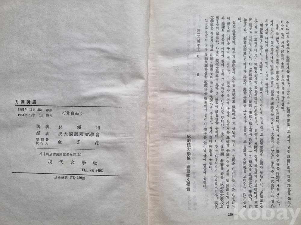 회갑 기념 한정본: 1901년생인 박종화 선생의 회갑(1961년)을 맞이하여 제자들이 헌정하는 형식으로 만든 시집입니다.