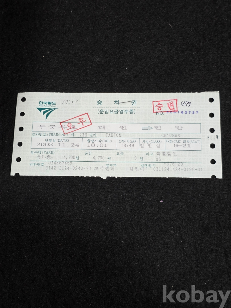 (((철도자료/지하철자료))) 2003년 한국철도 승차권 (무궁화호) (대전-천안) (승변)