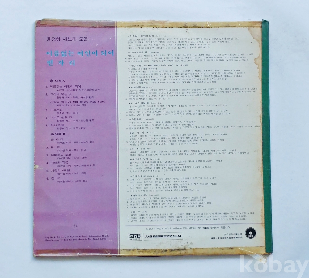 | 자켓상태 | VG : 주름, 접힘, 모서리 찢김 다수 | 음반상태 | EX : 재생에 영향 없는 가벼운 기스 존재 | 발매정보 | 알수없음 | 가사지여부 | 무 |