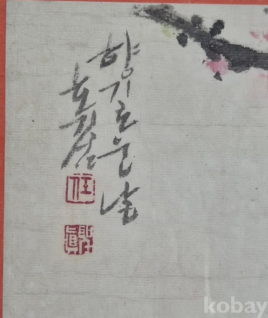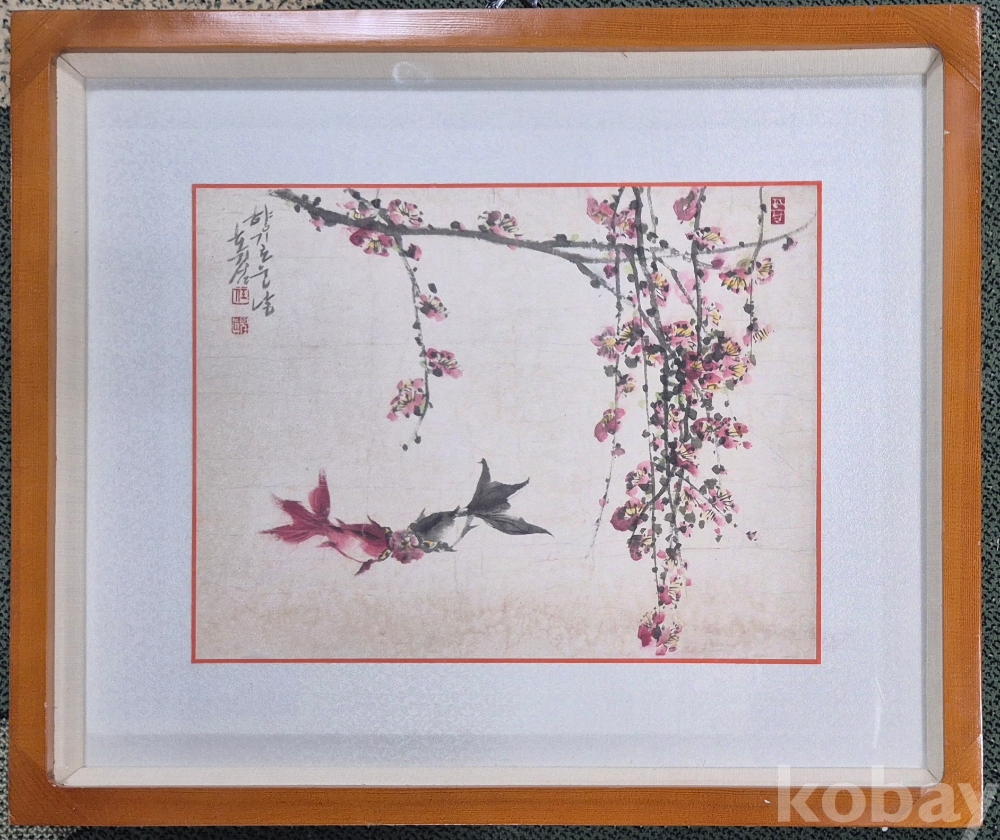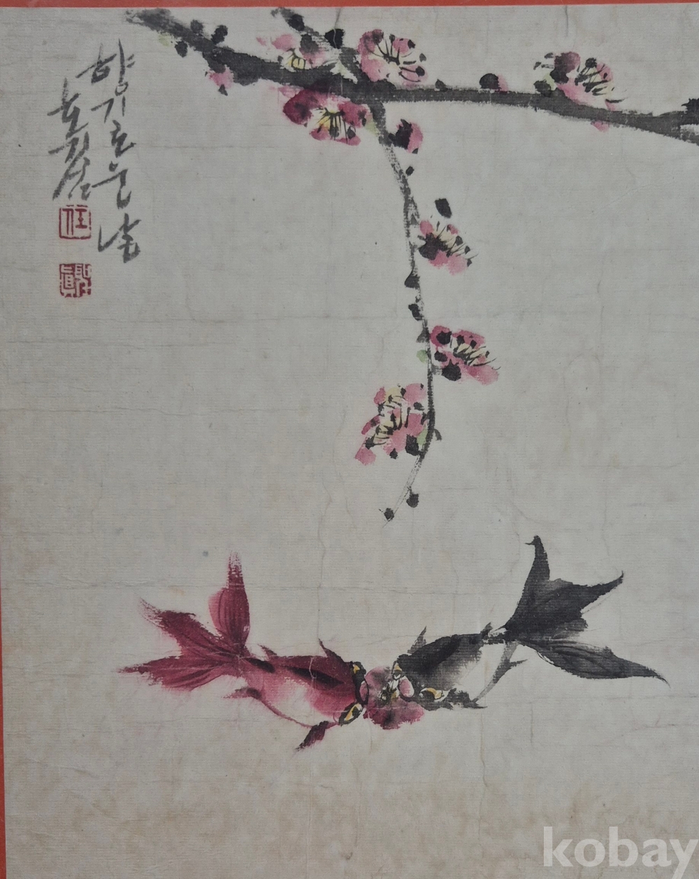 흐드러진 홍매와 금붕어 한쌍이 아름다운 조화를 이루는 작품성 최고의 멋진 작품입니다