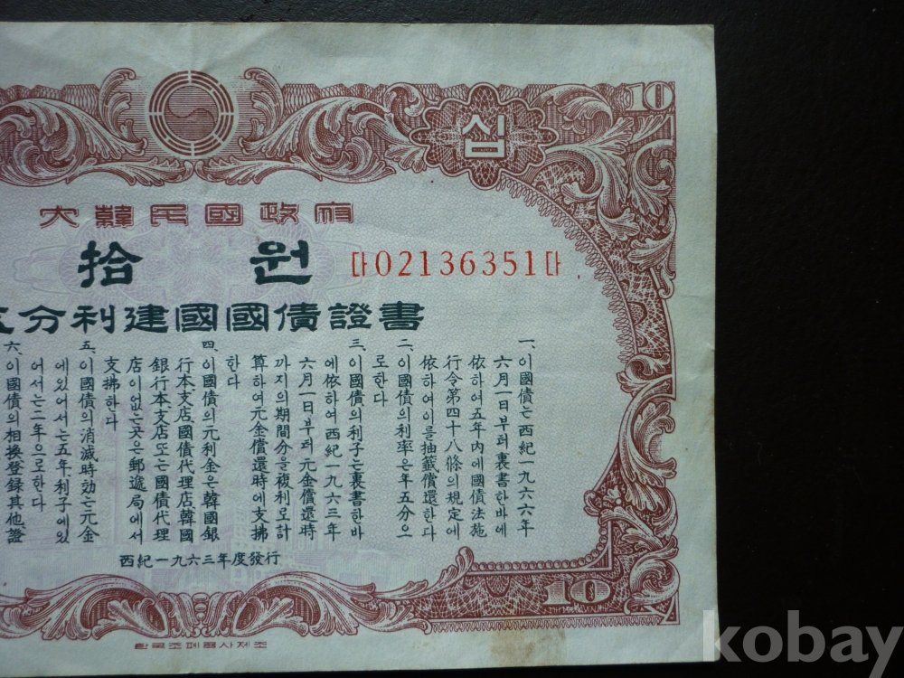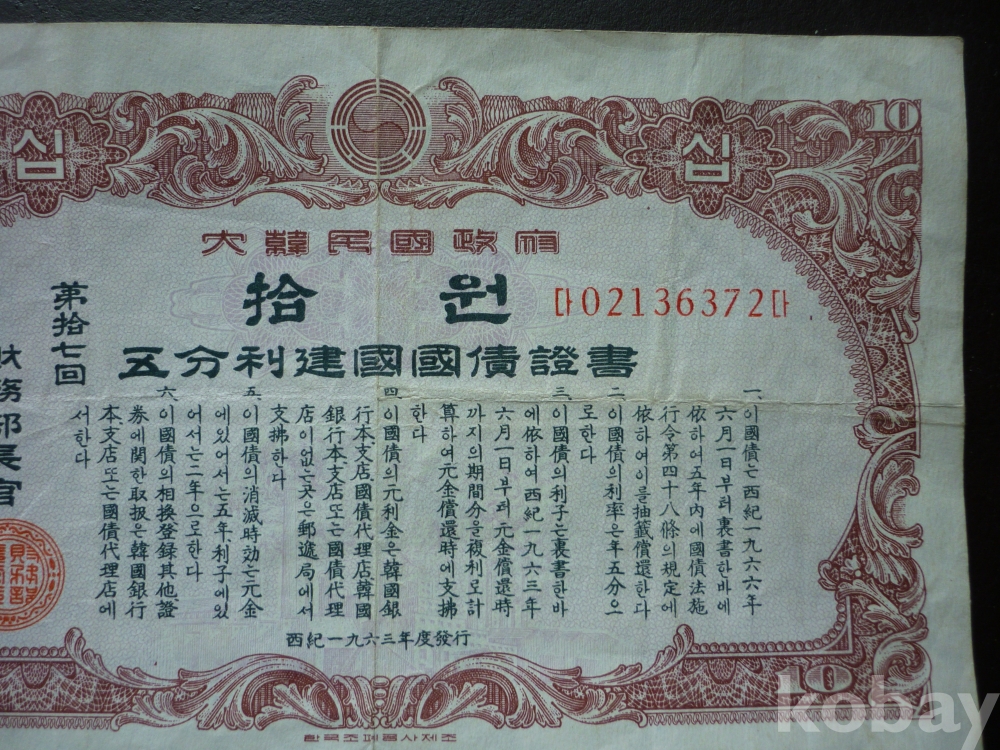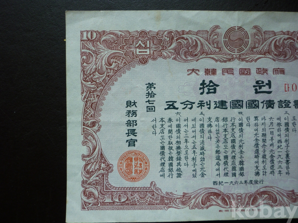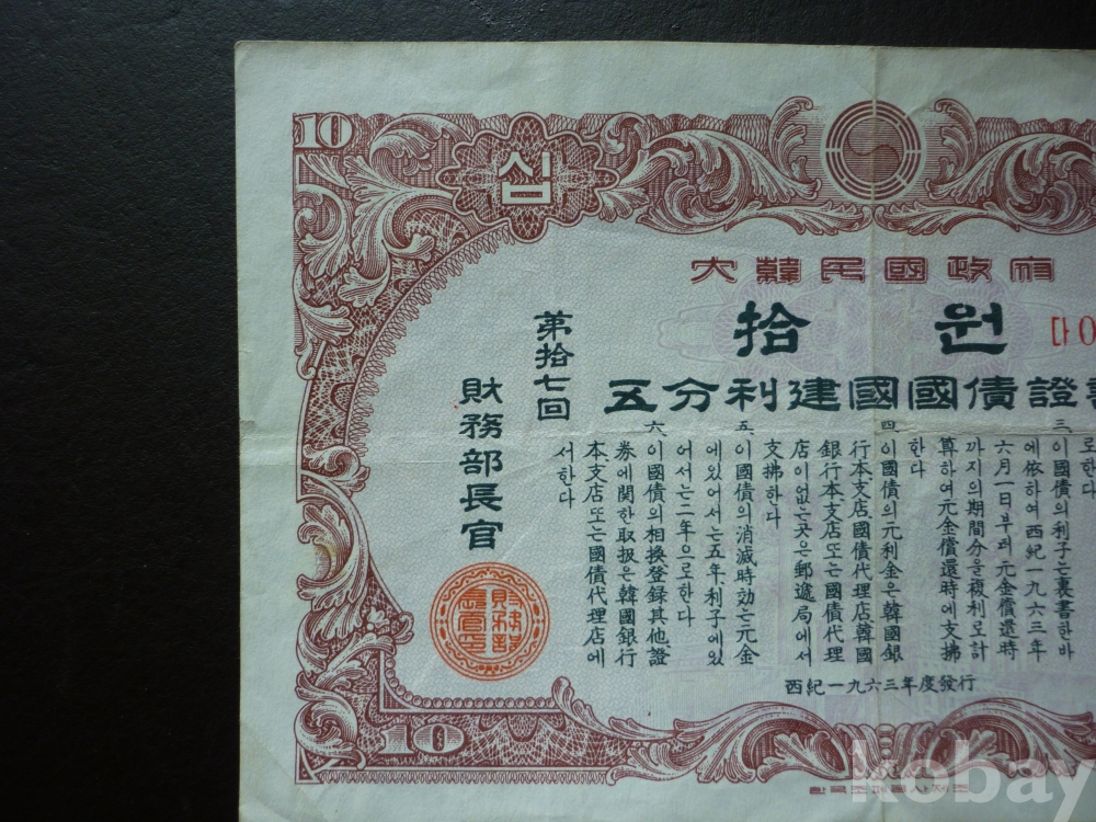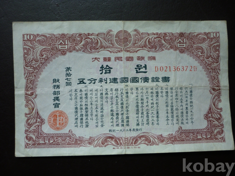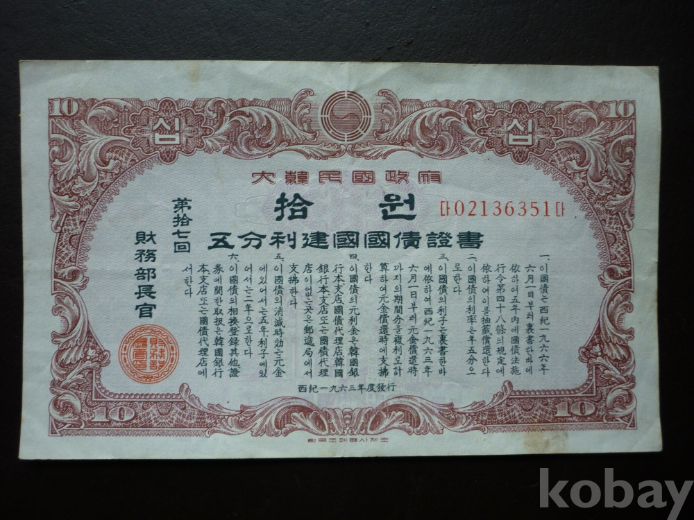 1963년 발행한 10원 건국 국채증서 2장