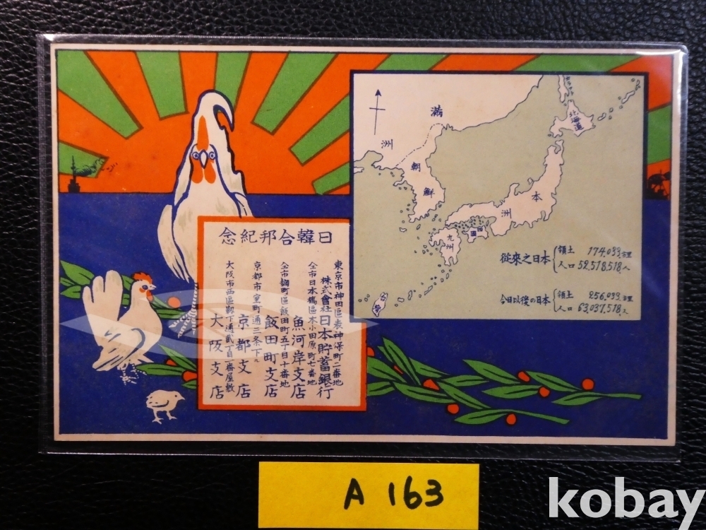▣병합된 한반도, 닭은 한국을 의미, 욱일 도안, 1910년 8월 29일(뒷면), 일본의 황거, 한국병합, 일제강점기 사진엽서, 그림엽서, 회엽서.