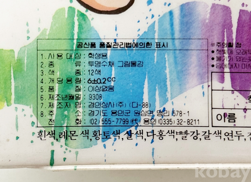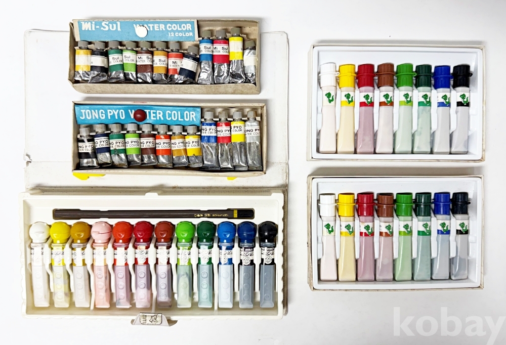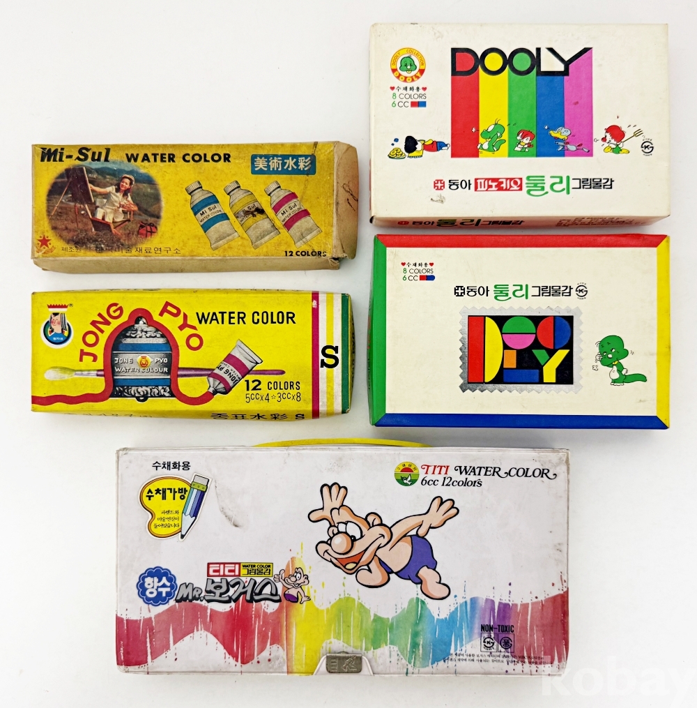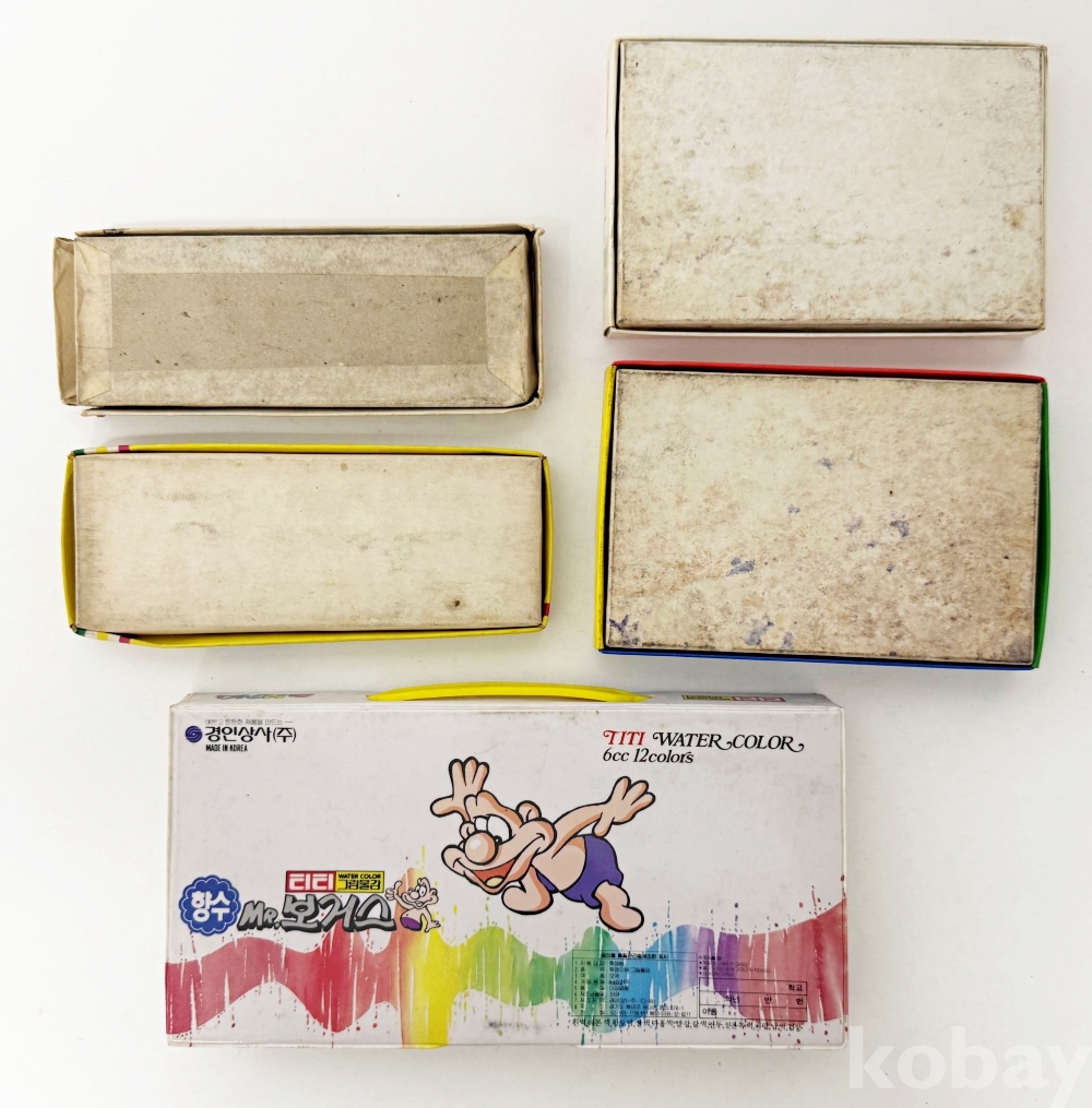 상품설명 | 1. 미술 물감 / 한국미술재료연구소 / 박스 모서리 트임 / 16.5 x 6 cm 2. 종표 물감 / 왕자문구(주) / 17 x 6.5 cm 3. 동아 피노키오 둘리 그림물감 / 동아교재(주) / 박스 하단 오염 / 16 x 10.3 cm 4. 동아 둘리 그림물감 / 동아교재(주) / 박스 하단 오염 / 16 x 10.3 cm 5. 향수 MR.보거스 물감 / 경인상사(주) / 24 x 12 cm | ||