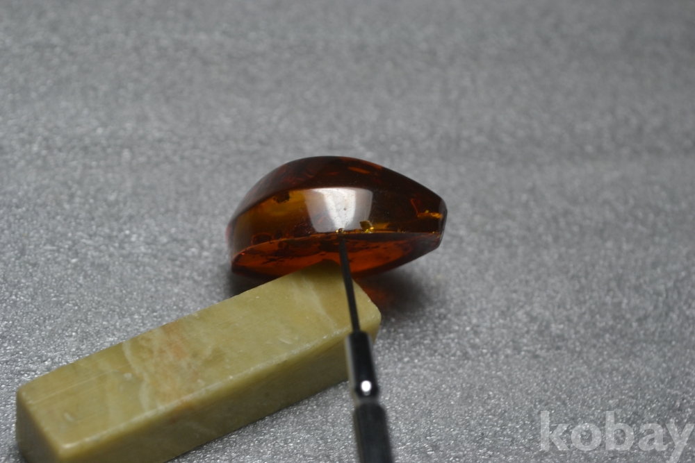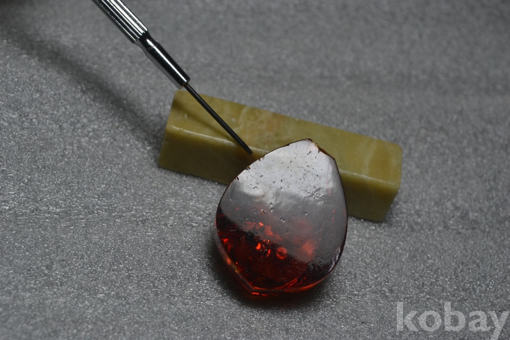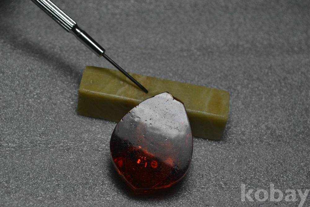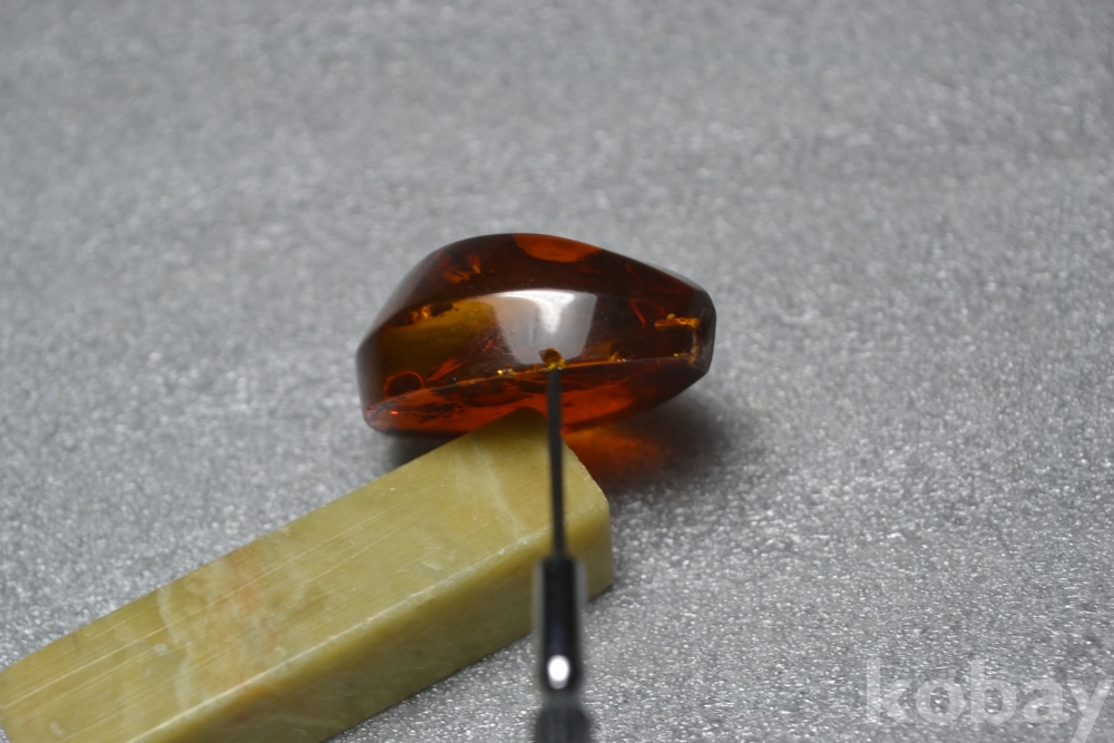 호박보석알의 테두리면을 보시면 미세한 작은 튐흔적들이 몇몇곳 있습니다. (검은핀으로 가르킨 부분들 사진참조)